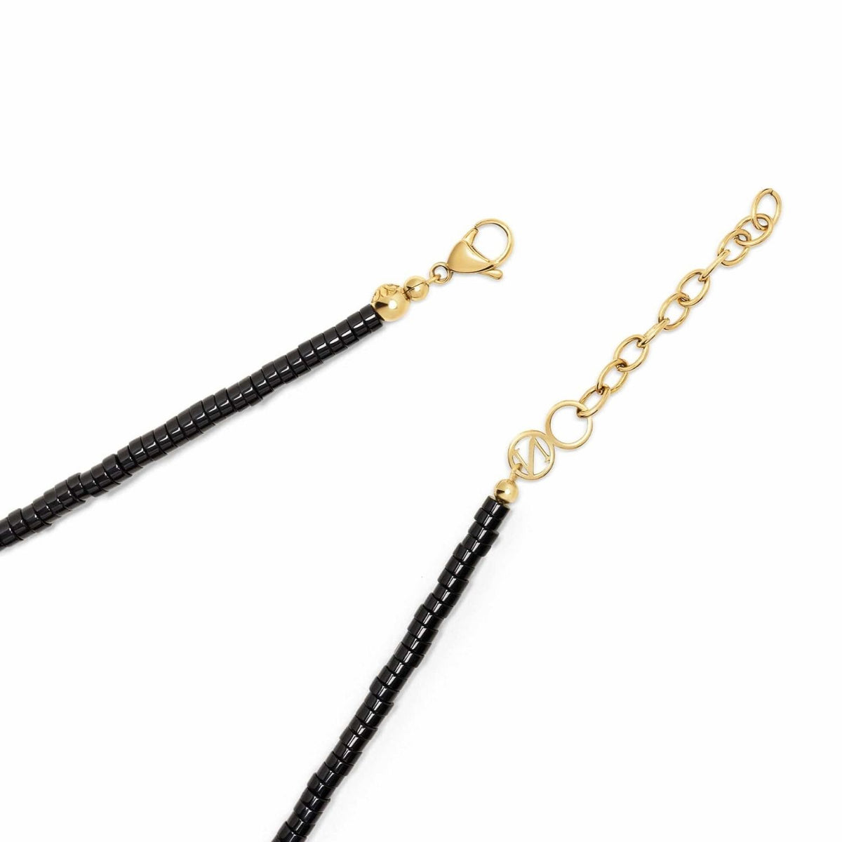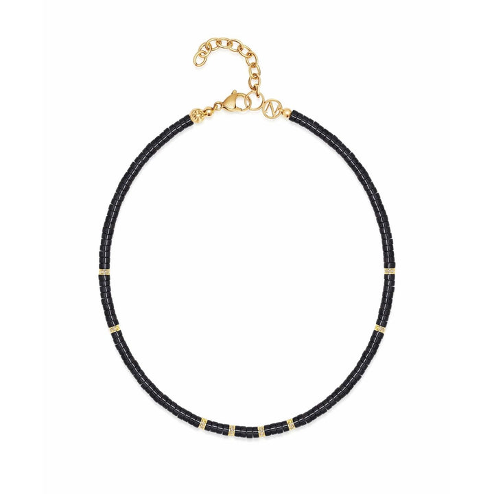 The Heishi Black Onyx Choker With Gold by Nialaya is a bold and elegant accessory. It is hand-strung with heishi black onyx beads, and at its center, it features a bold, cubic zirconia-adorned panther head. This choker is perfect for layering or wearing solo and is designed to stand out, making it a unique and confident piece.