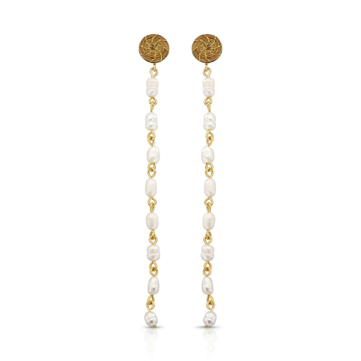 These earrings are handwoven from golden grass and golden nylon thread. They are made of 18K gold plated recycled brass and are nickel-free and hypoallergenic. They feature freshwater pearls.