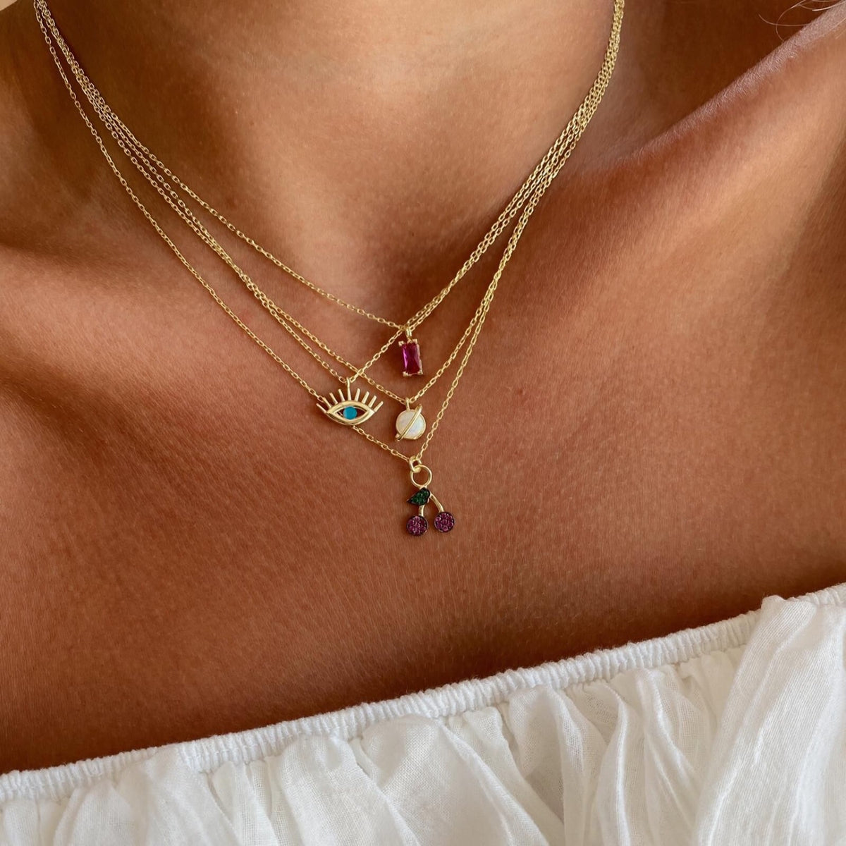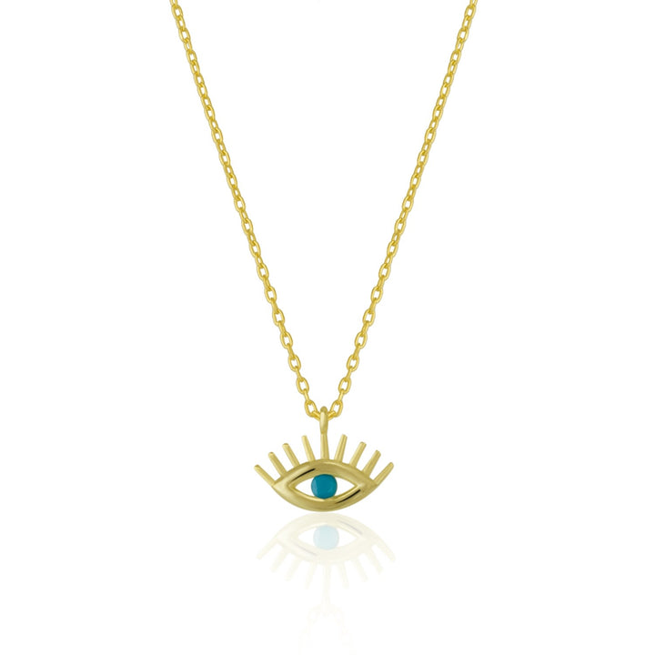 This necklace is crafted from sterling silver with a gold finish and features a detailed evil eye charm.