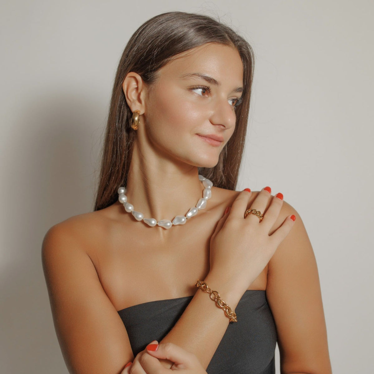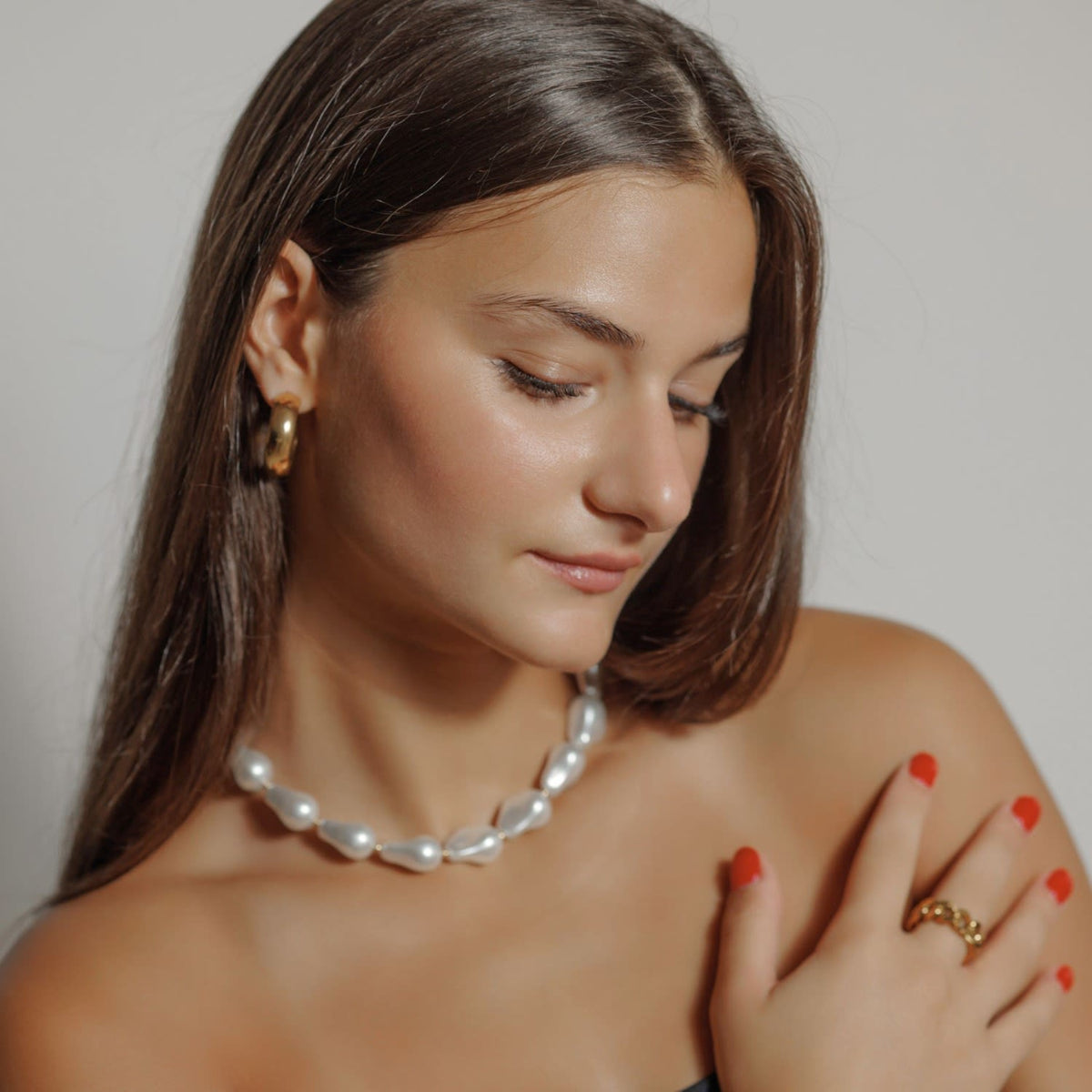 The Margaret Faux Baroque Choker Necklace by Viea is a captivating piece that combines timeless grace with a modern edge. It features a strand of faux baroque pearls, each with its own organic silhouette, interspersed with dainty 18k gold-coated stainless steel beads. This lightweight and lustrous necklace can be worn as a choker and brings effortless charm to both everyday moments and special occasions.