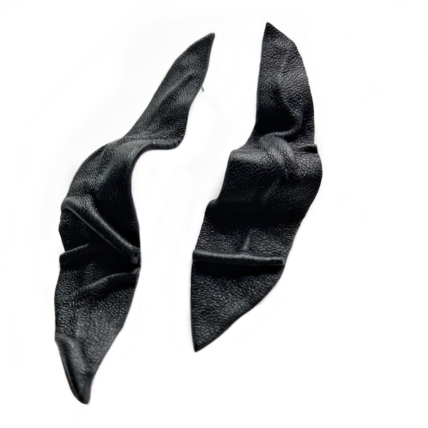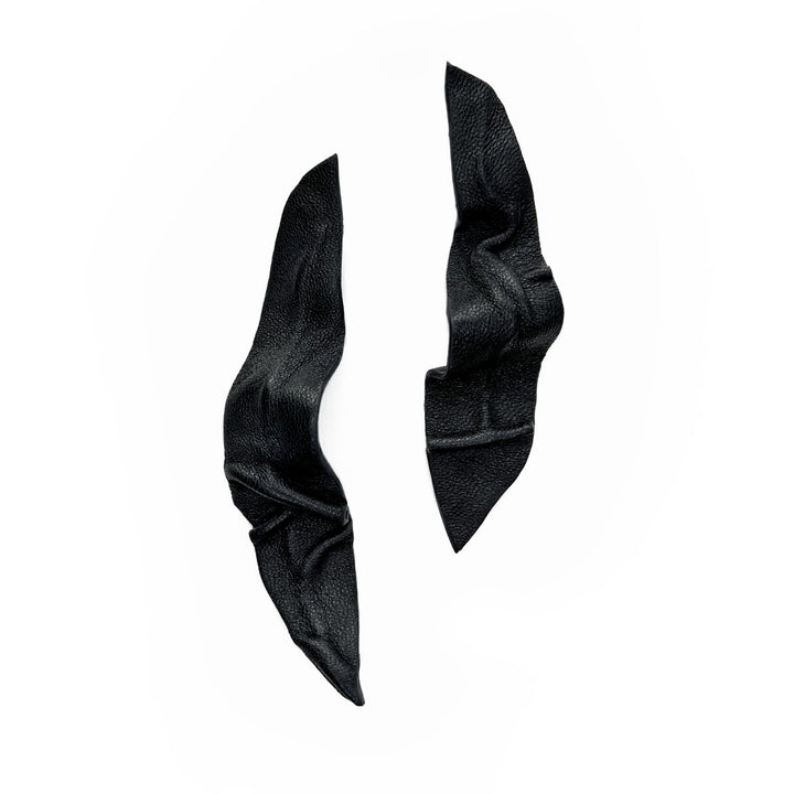 Handmade from soft black leather with concealed wire core for reshaping. Lightweight, sculptural drop earring design.