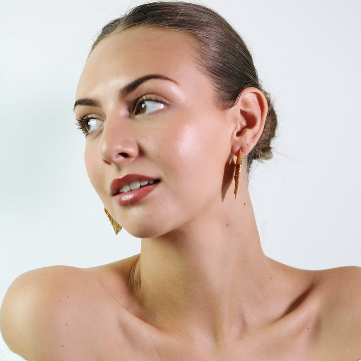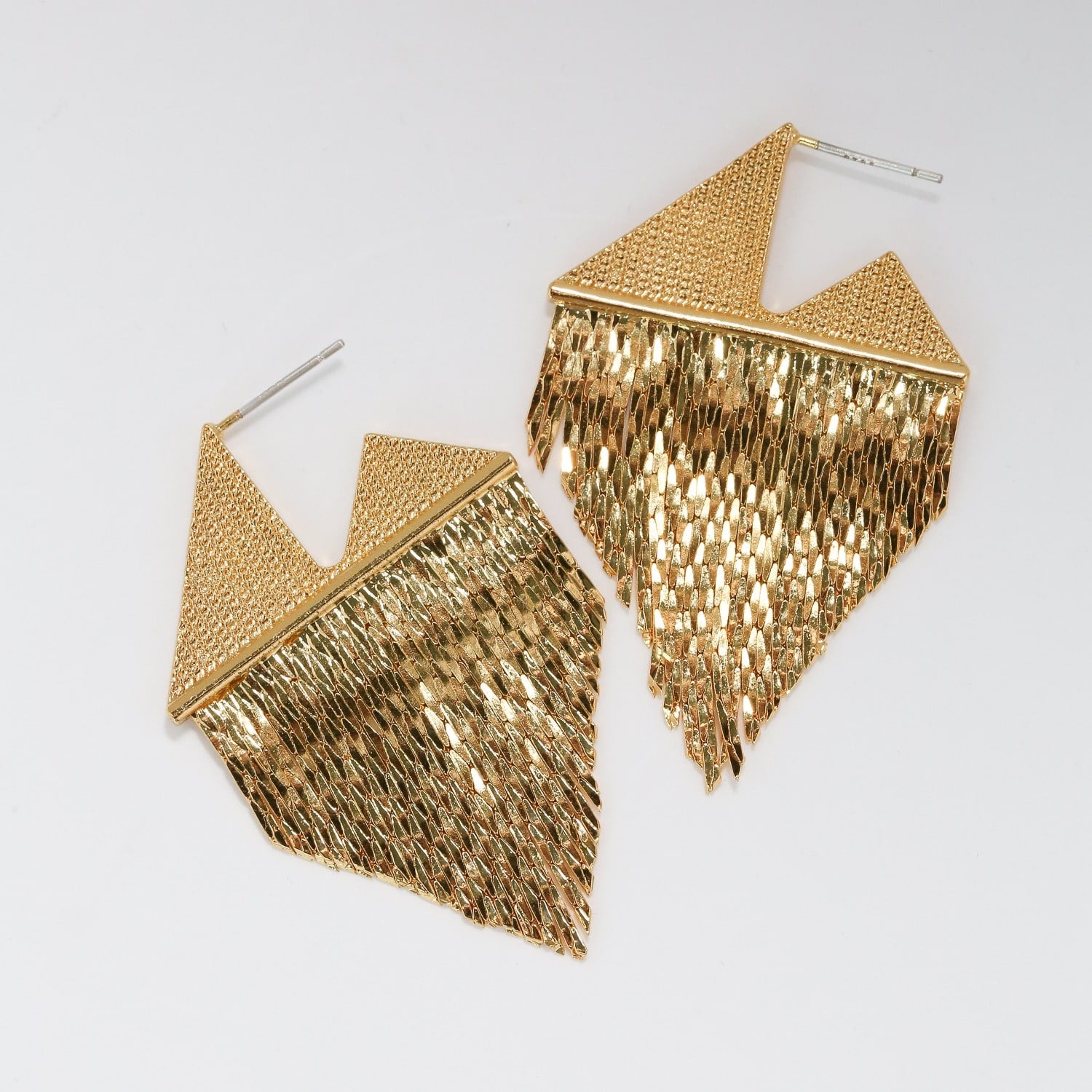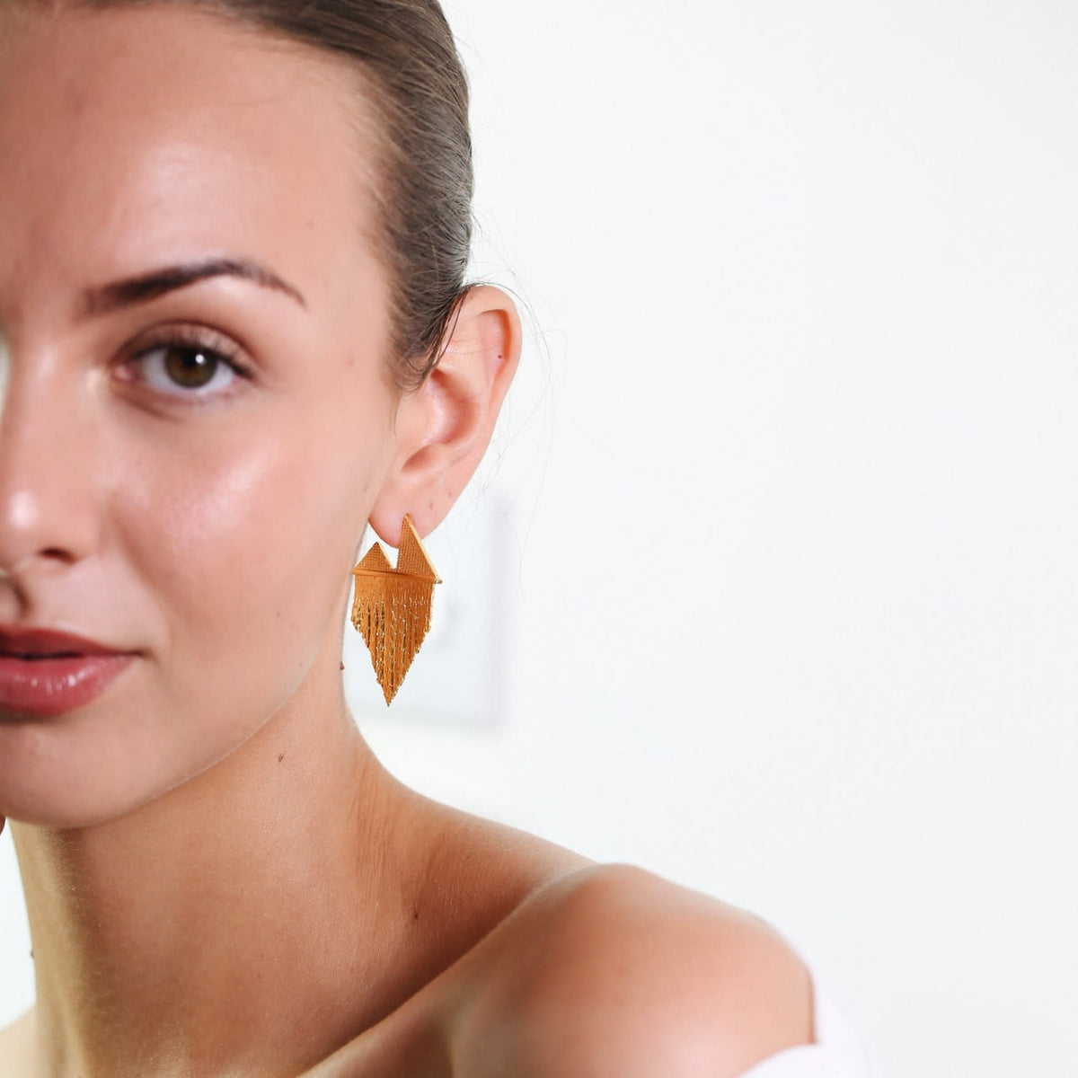 These earrings are crafted from 18ct gold-plated brass. They feature a unique architectural shape with a fringe-like texture. The ear posts are made of 925 silver. The earrings measure 4.3cm in length and 2.9cm in width.