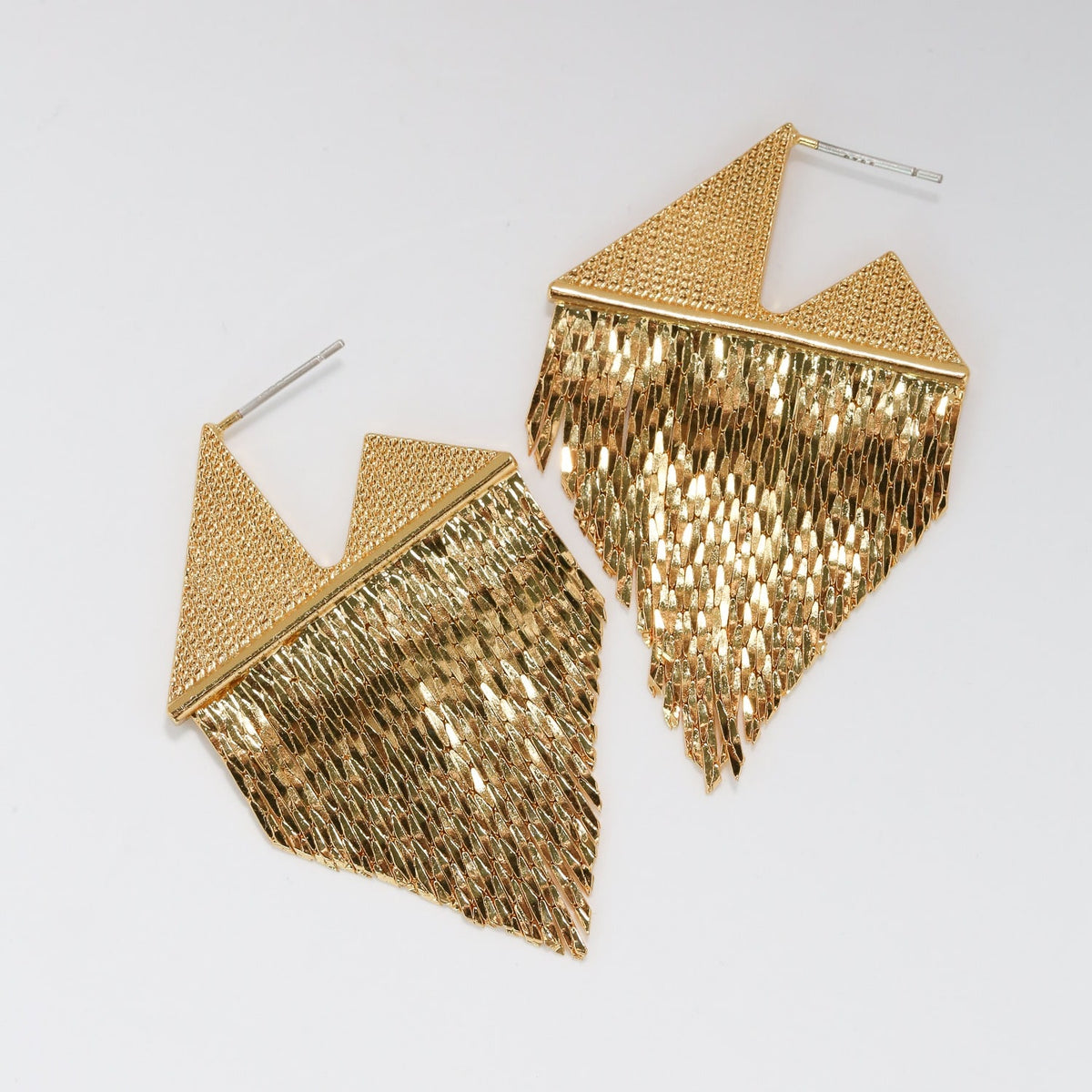 These Vega Fringe Earrings by Miss Cecilia are a statement piece that blends bold architectural shapes with a distinctive fringe-like texture. Meticulously plated with 18ct gold over brass, these high-quality earrings exude sophisticated elegance. Their versatile design transitions seamlessly from special occasions to everyday wear, making them an essential accessory for the discerning wearer. They are a testament to impeccable detailing and modern flair, perfect for adding a touch of confidence to any look.