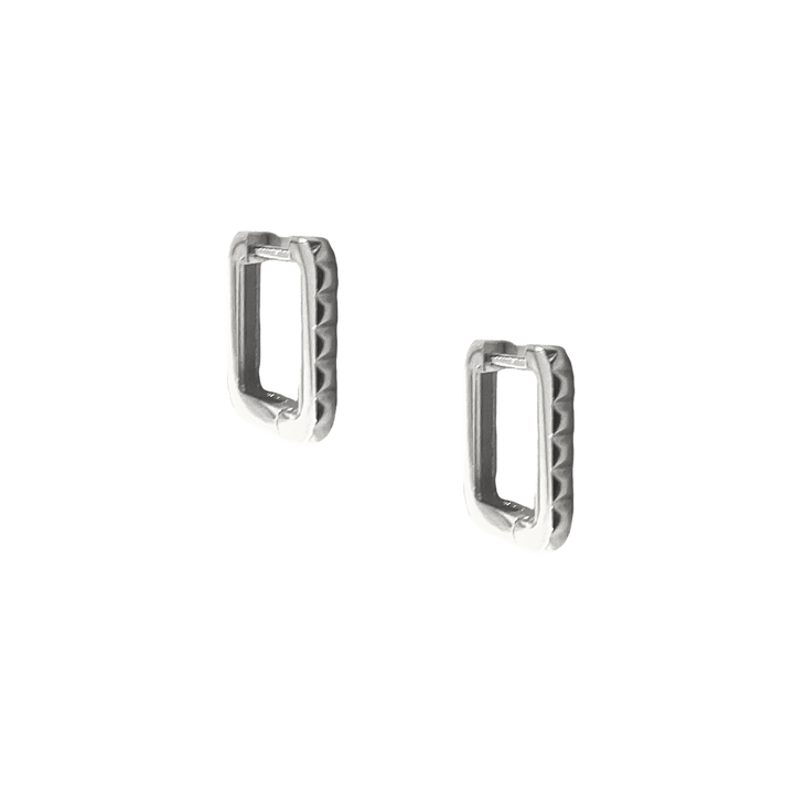 These Rectangular Hoop Earrings in Silver by Spero London are a chic reimagining of the classic hoop. The geometric rectangular shape with zigzag edges offers a modern edge, perfect for versatile styling from day to night.