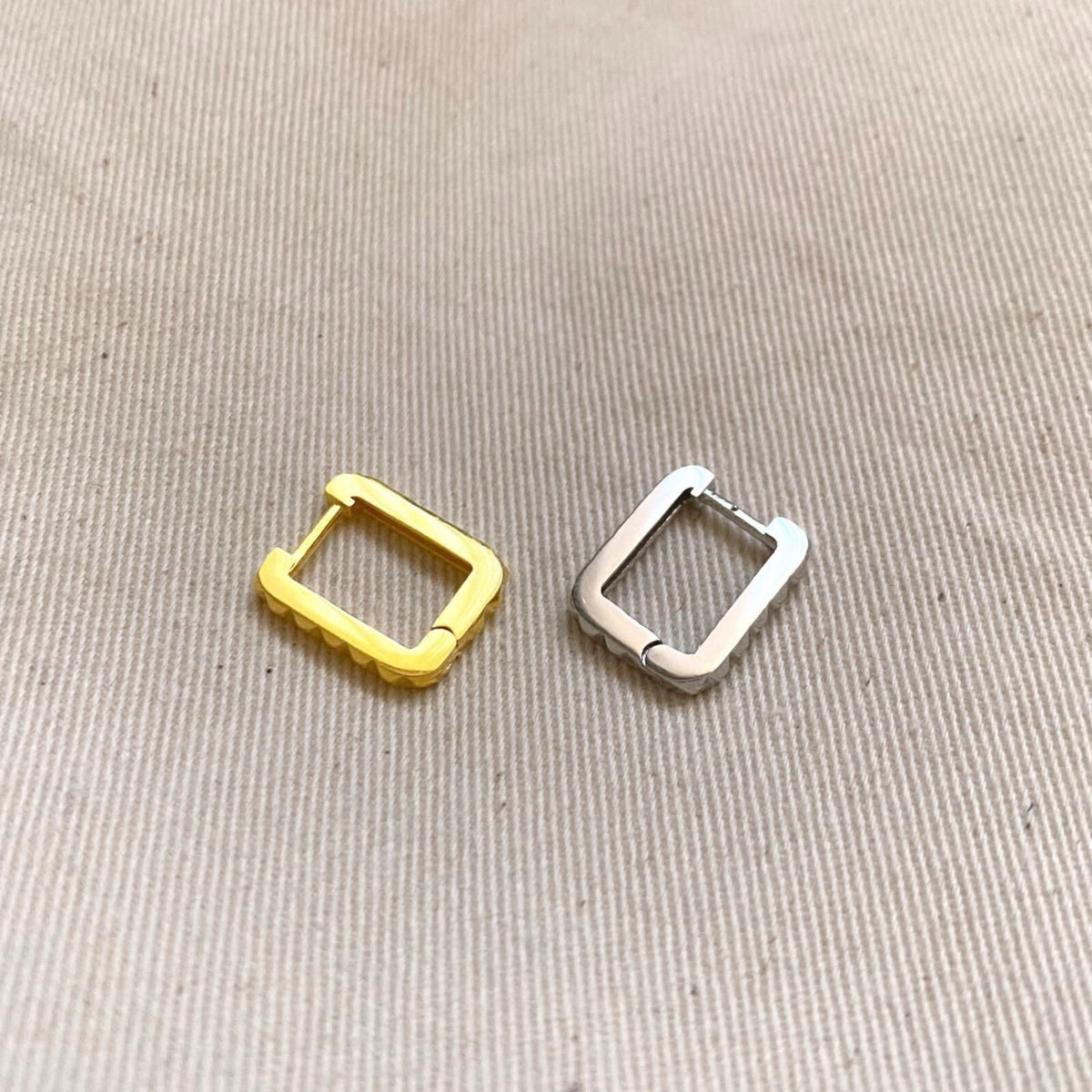 Crafted in recycled 925 sterling silver. Features rectangular hoop design with hinged-back clasp. Available in silver, rose gold, and gold finishes.