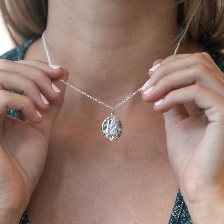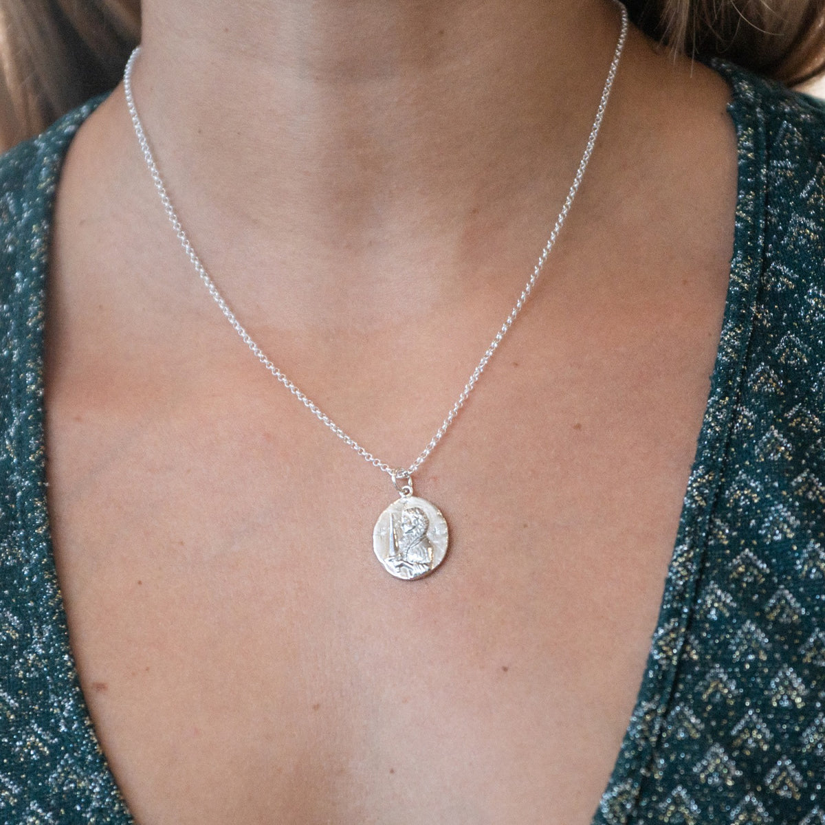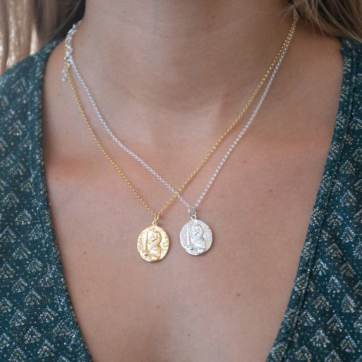 This necklace is made from 100% recycled 925 sterling silver. The charm features a maiden with a sword and is hypoallergenic, lead-free, and nickel-free.