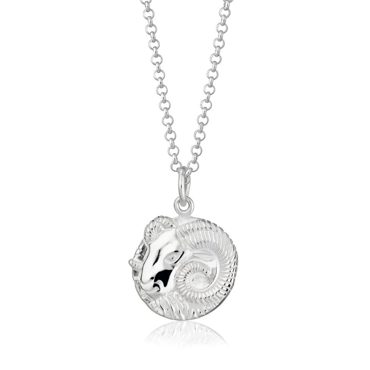 This Silver Aries Zodiac Charm Necklace by Scream Pretty is a beautiful and meaningful accessory for those born under the Aries sign. The celestial medallion, crafted from 100% recycled sterling silver, features the Aries ram with its long spiral horns, symbolizing energy, determination, and strength. This horoscopic necklace is a powerful statement piece that adds a sense of power to any outfit.
