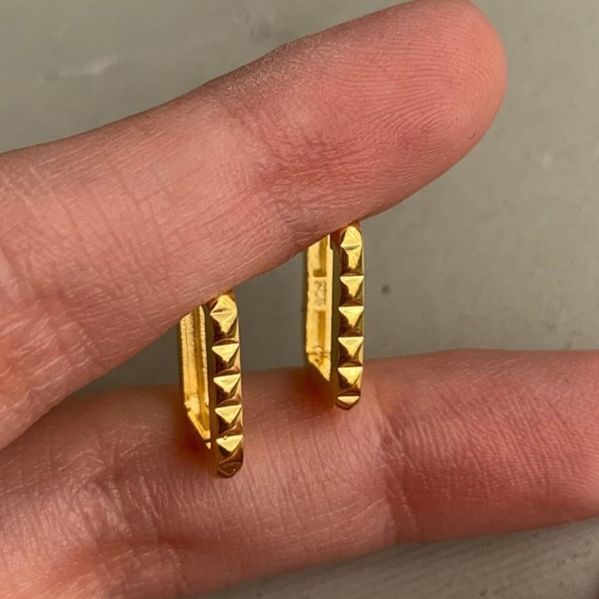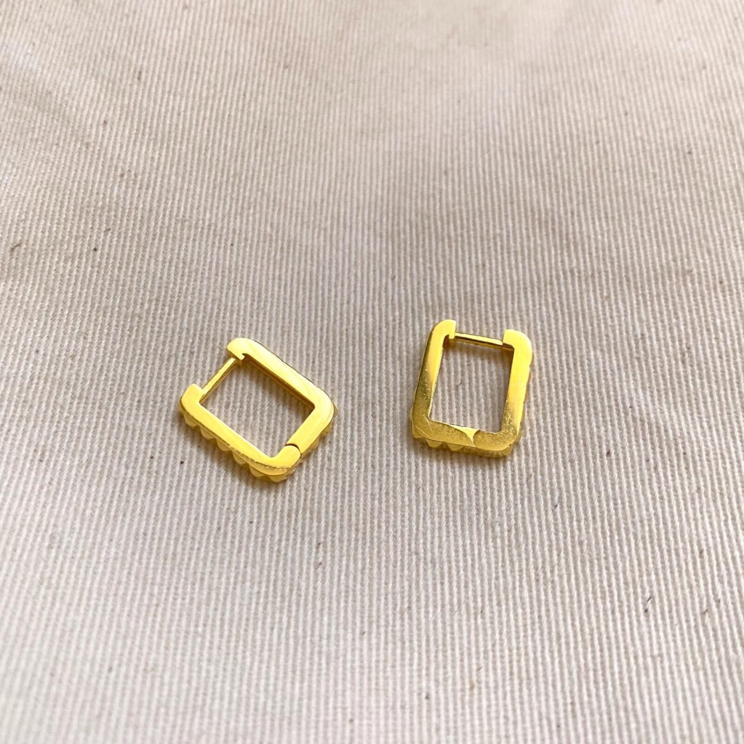 Cast in 925 recycled sterling silver with gold plating. Rectangular hoop design with hinged-back closure.