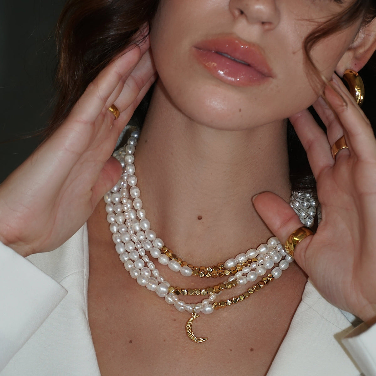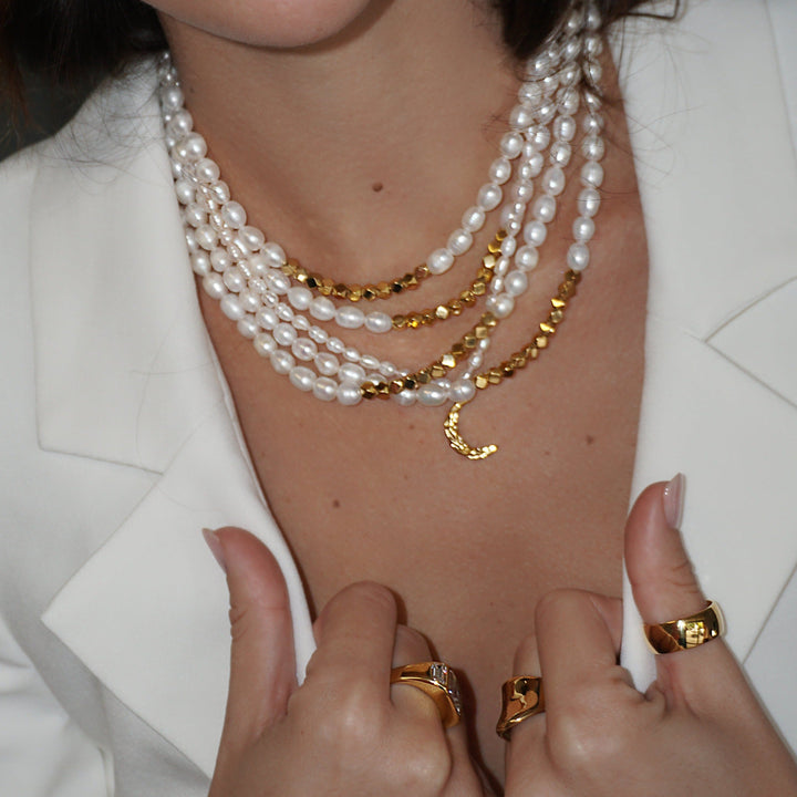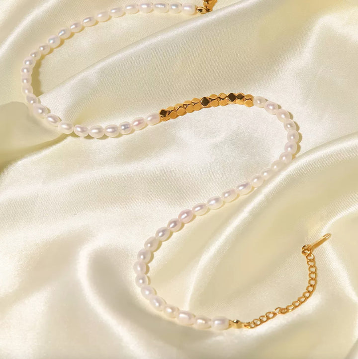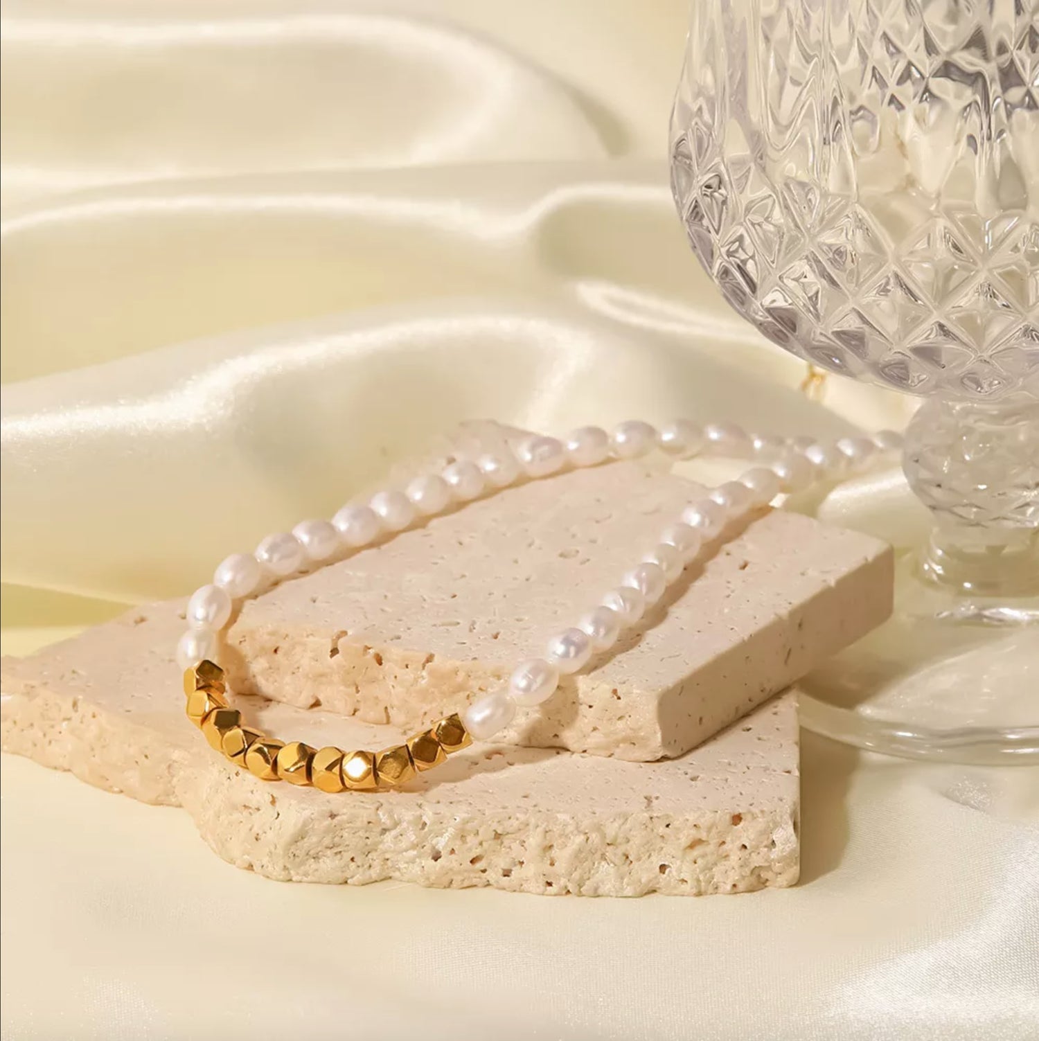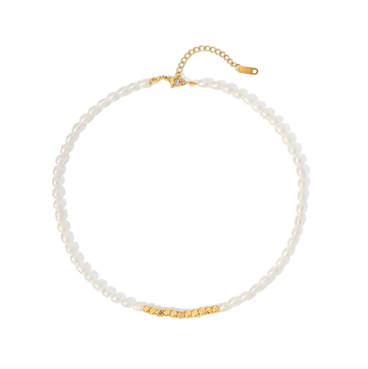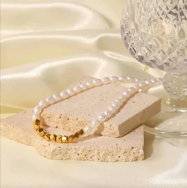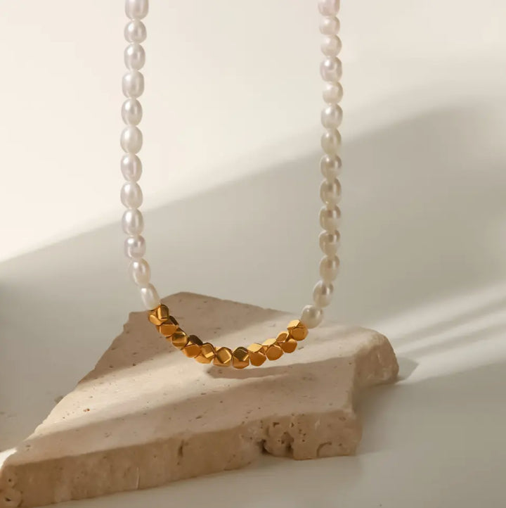 This handmade necklace features genuine freshwater pearls and geometric gold beads. It is crafted from 18k gold-plated stainless steel.