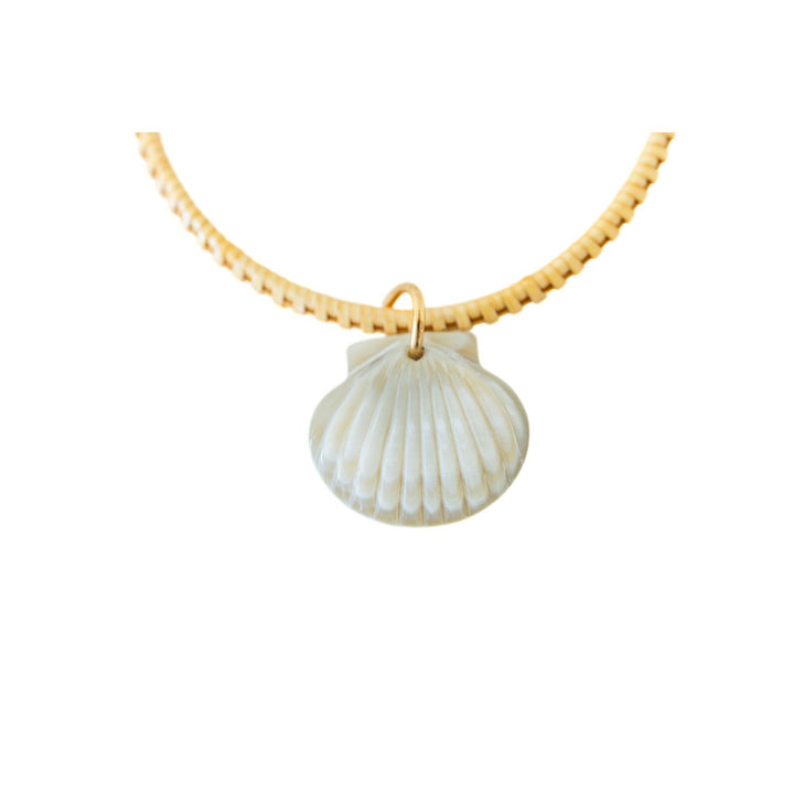 This bangle features a charm hand-carved from buffalo horn in a seashell design. The product description does not explicitly state the material of the bangle itself.