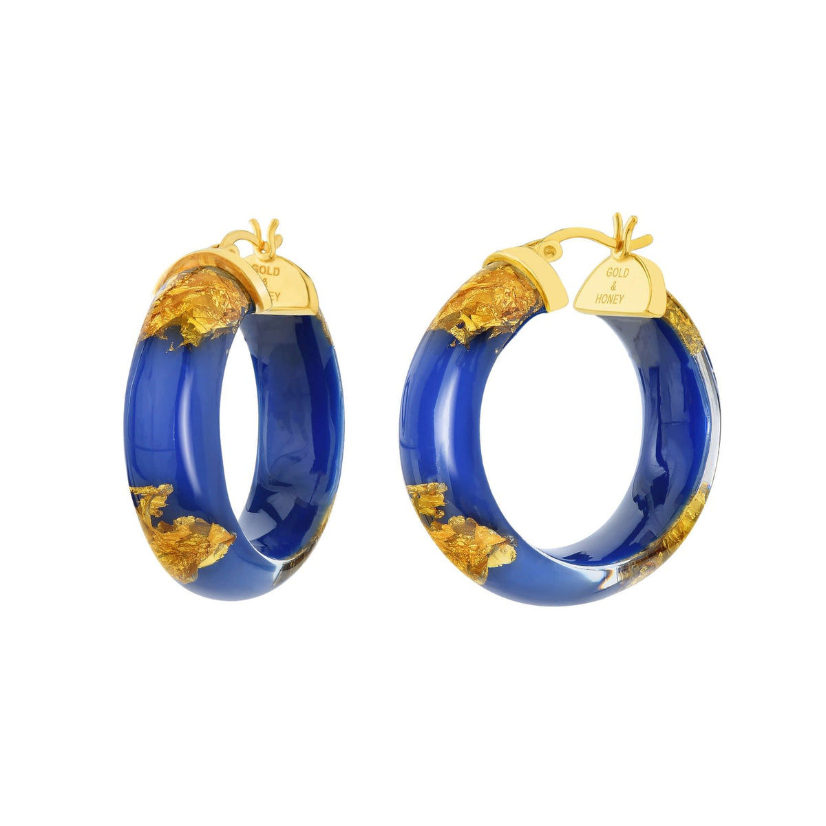 These huggie hoops are handcrafted from lucite and feature 24K gold leaf. The specific metal of the posts is not listed, but they are described as gold-plated.