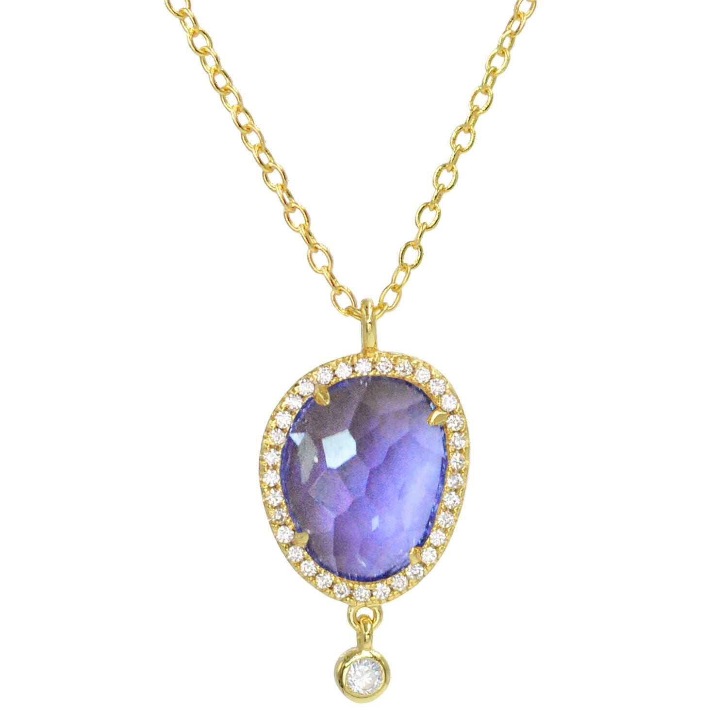 This necklace is made with a 14k gold-plate over 925 sterling silver. It features a lab-created tanzanite-colored gemstone and pave crystals. It has an adjustable silicon slider clasp and can be worn up to 46cm.