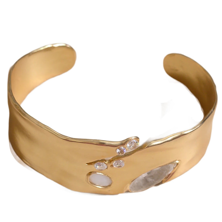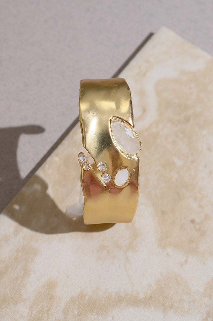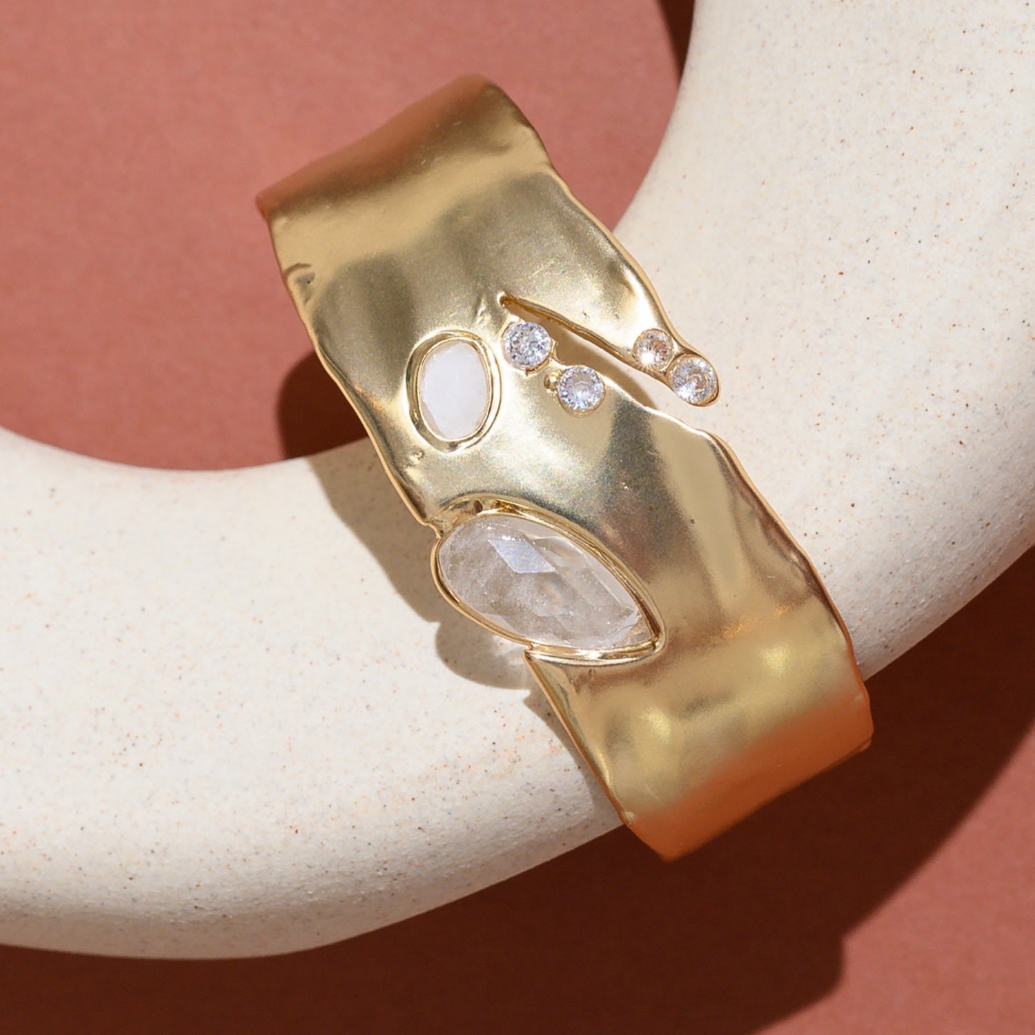 This cuff bracelet is made from Brass (80%) with 14kt Real Gold Plating (10%) and features Clear Quartz Gemstones and CZ (10%). It is handcrafted.