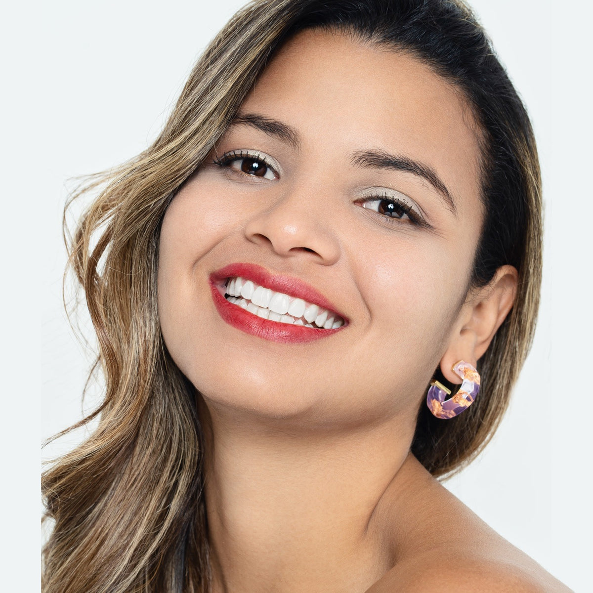 These 24k Gold Leaf Faceted Huggies in Purple by Gold & Honey are small but bold, crafted from faceted lucite that gleams with hand-applied gold leaf. Lightweight and luminous, they add a pop of rich color and texture that transitions seamlessly through the seasons.