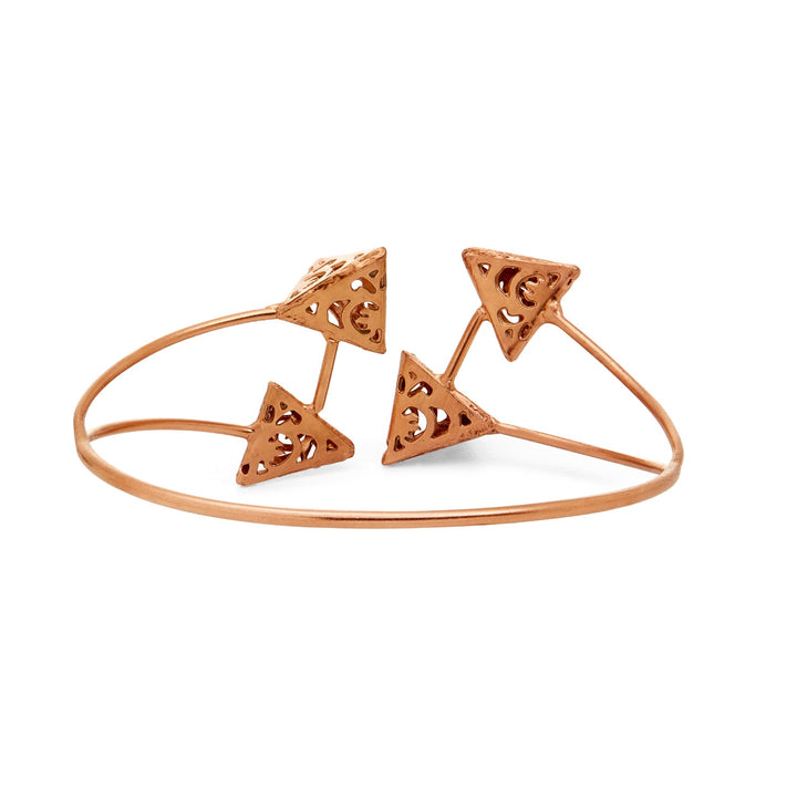 This Adjustable Rose Gold Mehr Cuff by Dhwani Bansal is a striking statement piece that elegantly fuses intricate filigree work with origami-inspired design. Its handcrafted details and stunning rose gold plating give it a unique, luxurious feel. The cuff is open and adjustable, ensuring a perfect fit while providing a sense of comfort and freedom. This cuff embodies the deep and beautiful poetry of Rumi, making it a truly meaningful accessory for any occasion.