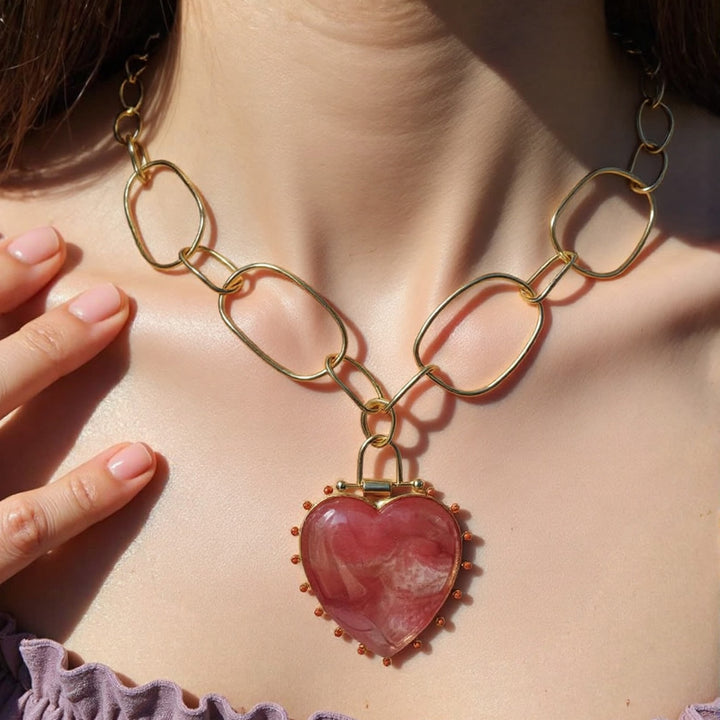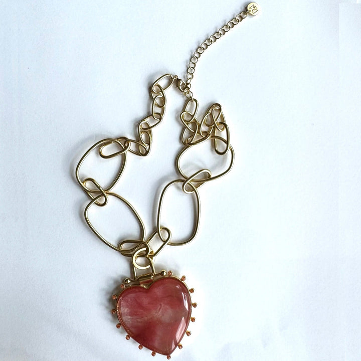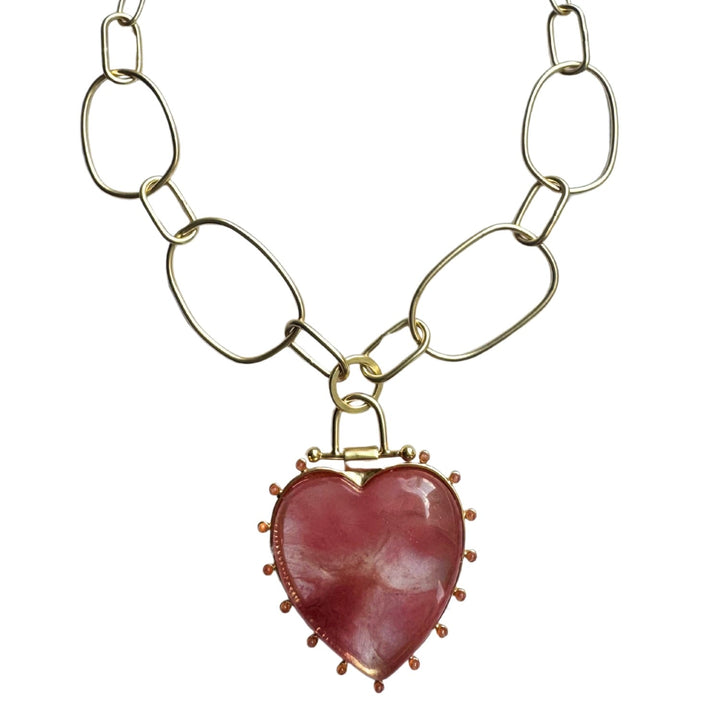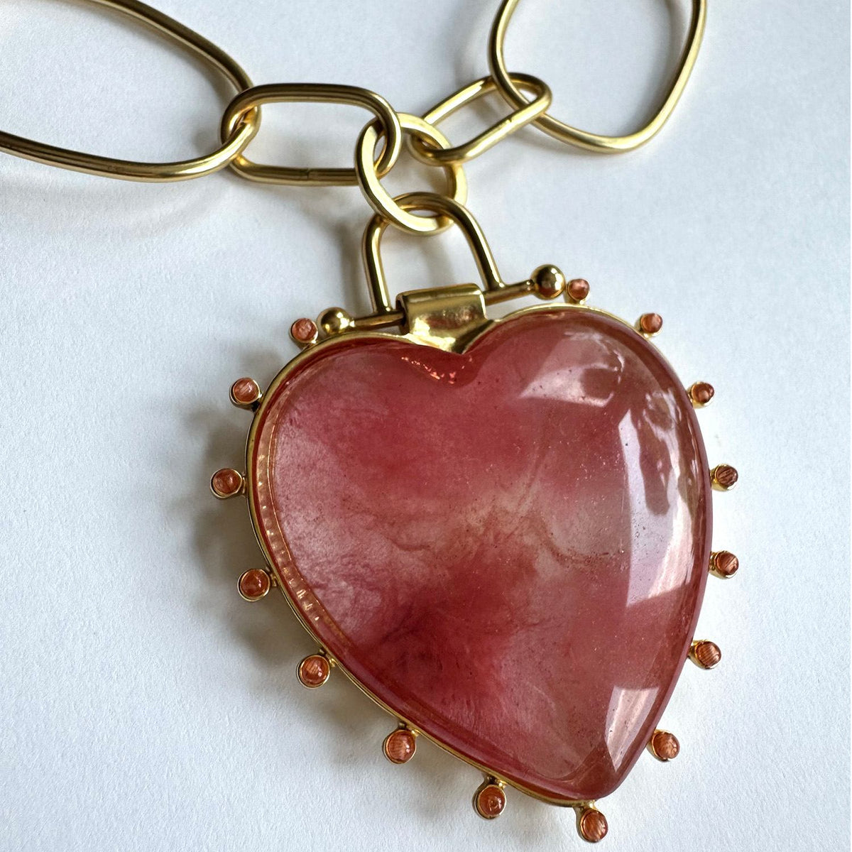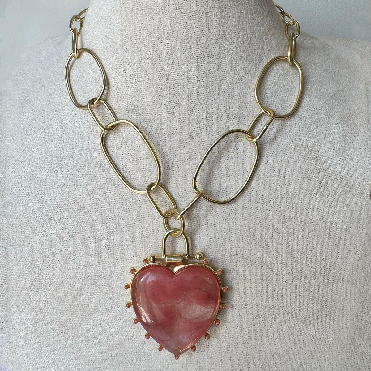 This necklace features a heart-shaped strawberry quartz pendant and matching quartz beads. It is hand-assembled with a 14Kt real gold-plated chunky chain with organic links.