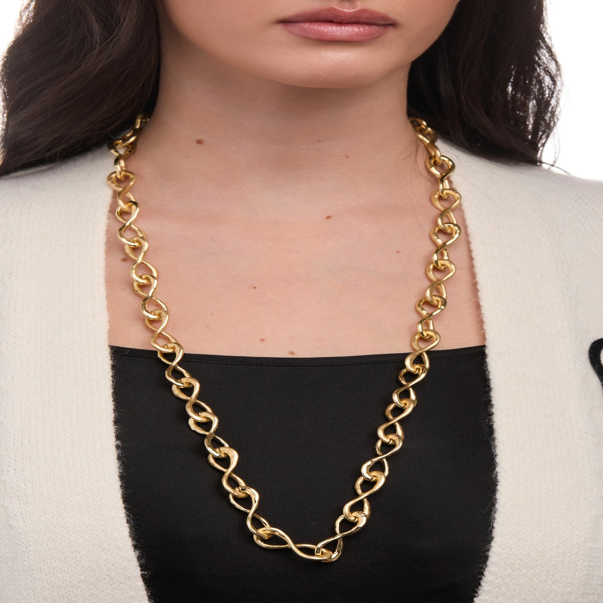 This necklace is a gold-toned infinity chain link design. It features a lobster claw clasp and is adjustable.
