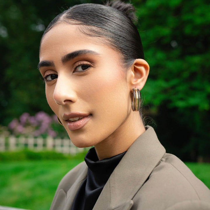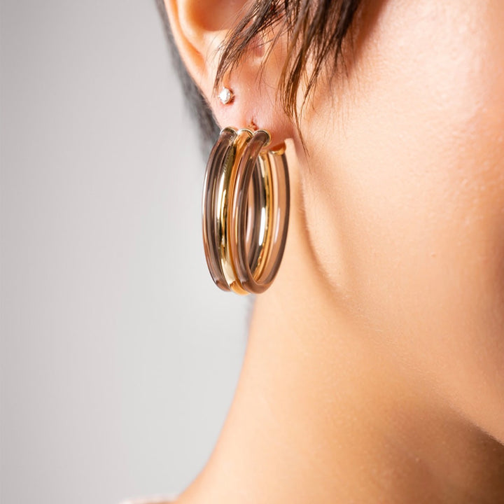 These Ridge Hoops In Blackberry by Gold & Honey are a unique and stylish accessory. These statement hoop earrings combine lucite and gold metal to create a dimensional and unique look. They are the perfect size for everyday wear and will add a bold element to your jewelry box. The contrast of the materials makes these hoops stand out while remaining a versatile everyday staple.