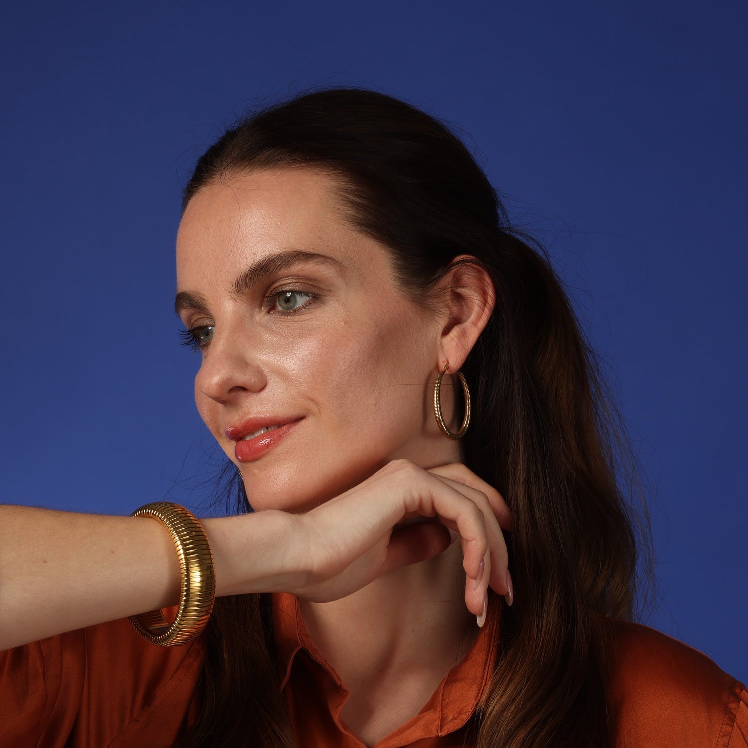 This bangle is a 20mm wide cobra design, crafted from gold-plated brass.