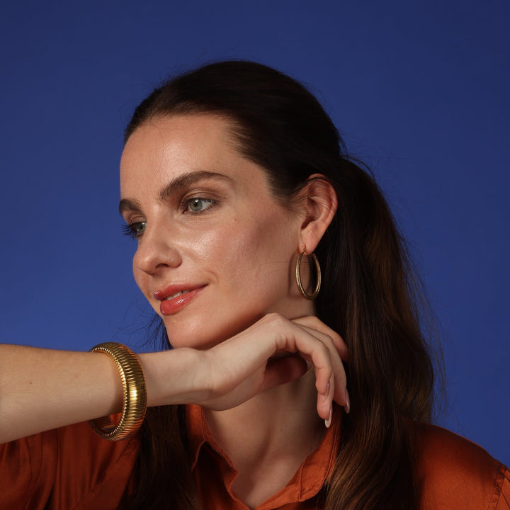 This Wide Gold Plated Cobra Bangle by Michael Nash Jewelry is a bold and sculptural statement piece. Its sleek, fluid design adds a touch of modern luxury and effortless elegance to any outfit. Whether worn alone for a refined look or stacked with other bangles for maximum impact, its coiled shape exudes confidence and sophistication. This bangle is a must-have accessory for those who love to stand out with style.