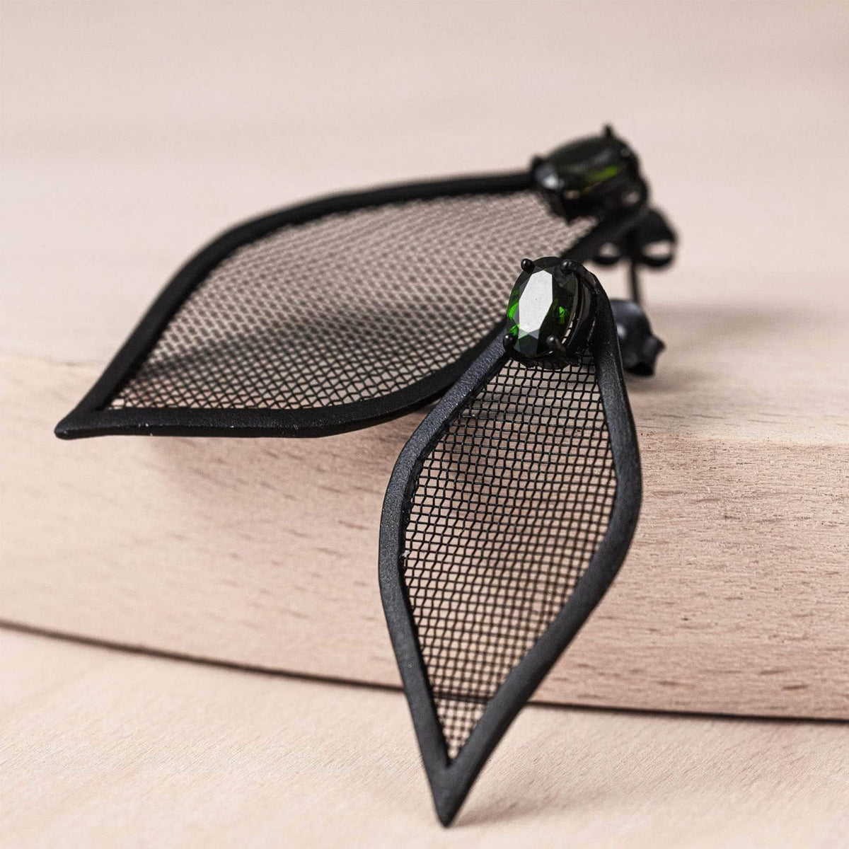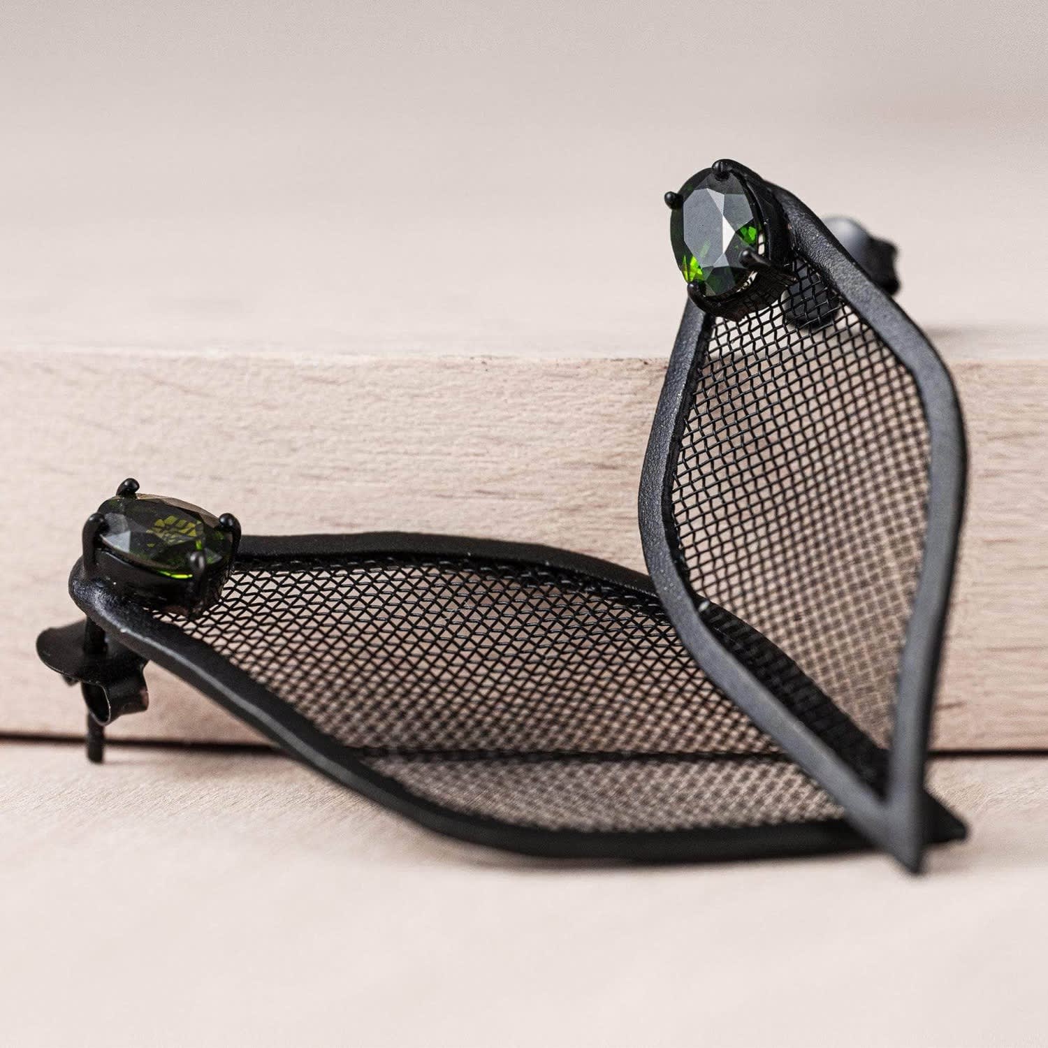 These Liora Asymmetric Leaf-Shaped Silver & Titanium Mesh Earrings With Chrome Diopside by German Kabirski blend organic inspiration with bold design. Shaped like asymmetrical leaves, they're crafted from 925 sterling silver and titanium mesh with an anthracite plating for a deep black finish. An oval-cut green Chrome Diopside adds a vivid contrast, creating a unique harmony of color and texture. These earrings are designed for trendsetters who appreciate fresh, edgy, and one-of-a-kind pieces.
