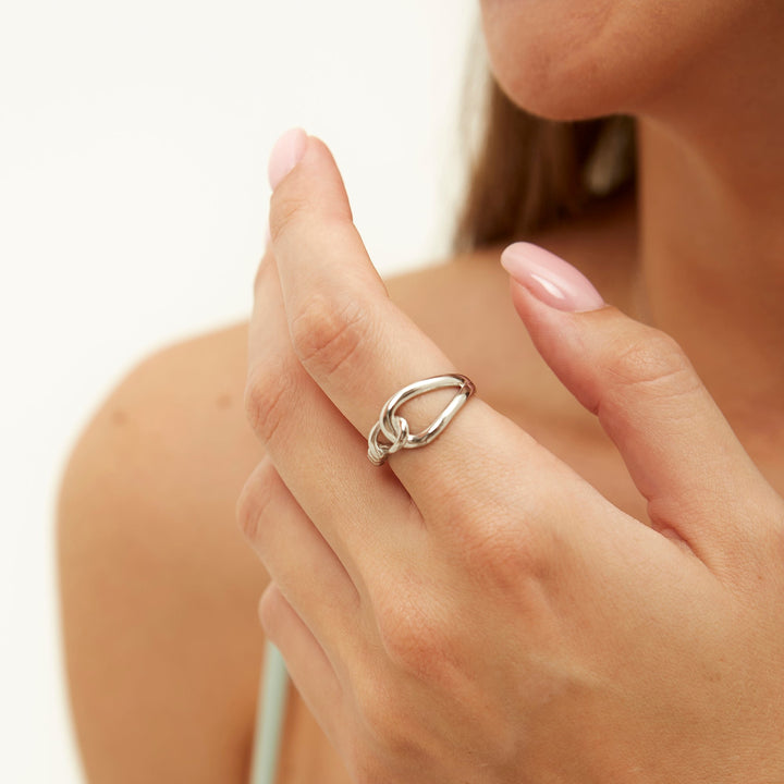This adjustable ring is fashioned from 925 sustainable sterling silver. It showcases knotted circles with twisted details and a polished finish. It is available in silver and gold tones.