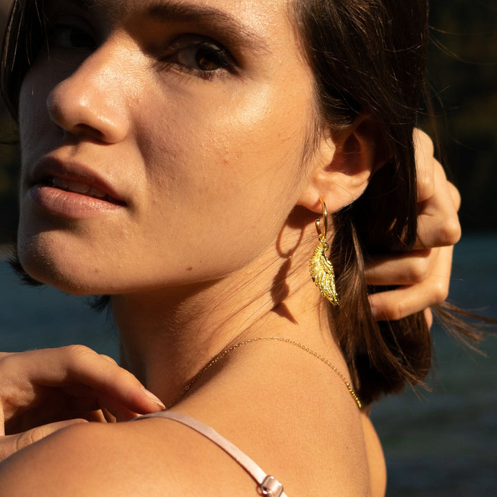 Angel Wing Hoop Earrings by Seven Saints are a spiritual and luxurious statement. Crafted from solid sterling silver and plated in 18k gold, the decadent carved design represents protection and spiritual awareness. Featured in Vogue Italy, these earrings are a constant reminder of guidance and self-empowerment. They offer a sense of safety and are perfect for elevating a look with both meaningful symbolism and high-end, classic style.