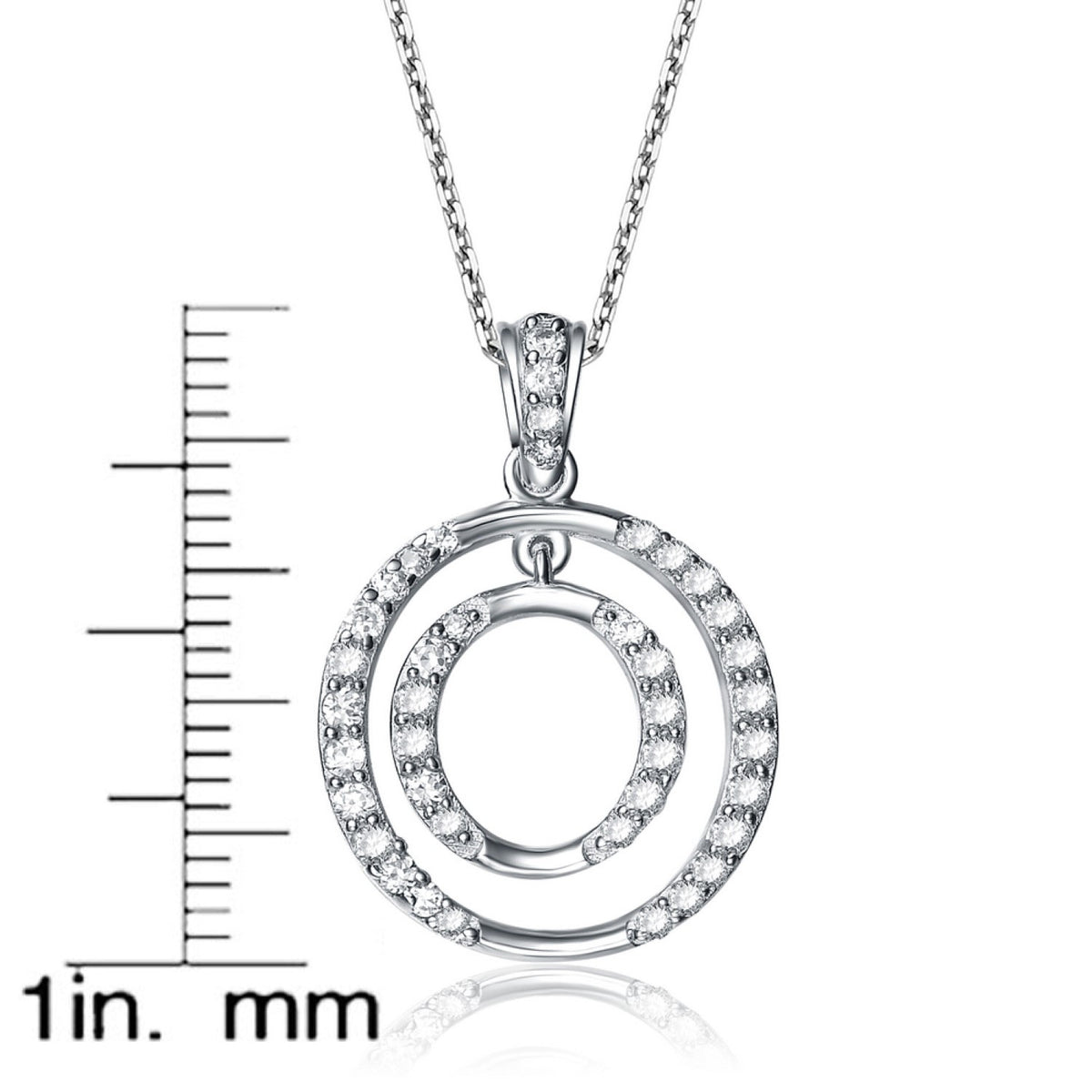 This necklace is crafted from 925 sterling silver with a white gold plating. The pendant features two outlined circles with cubic zirconia stones and a spring ring clasp.