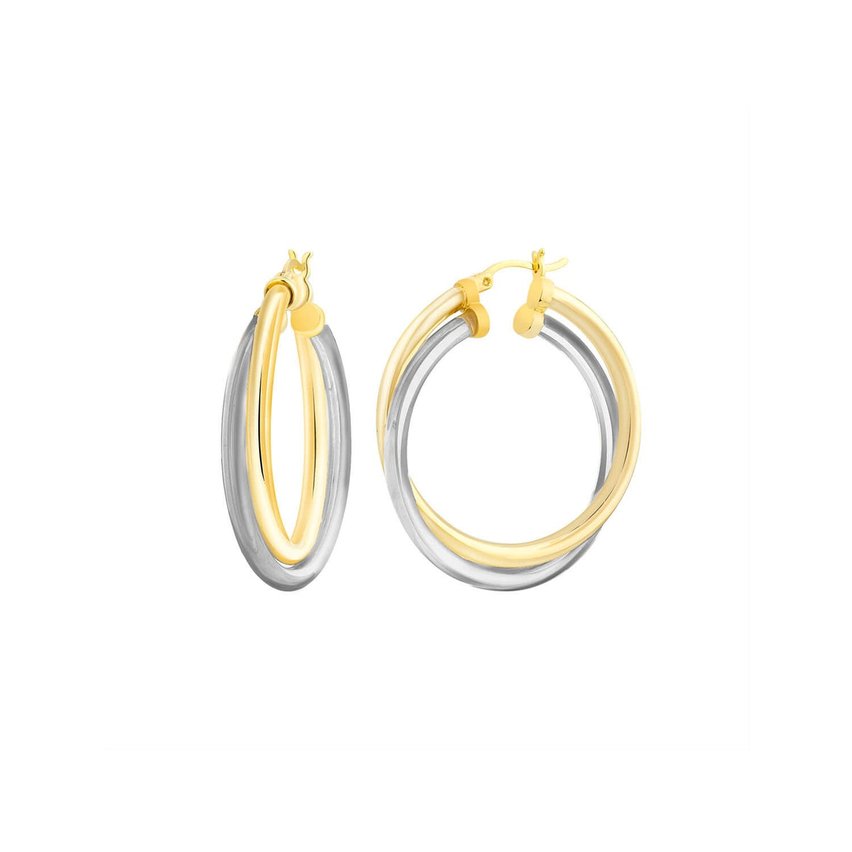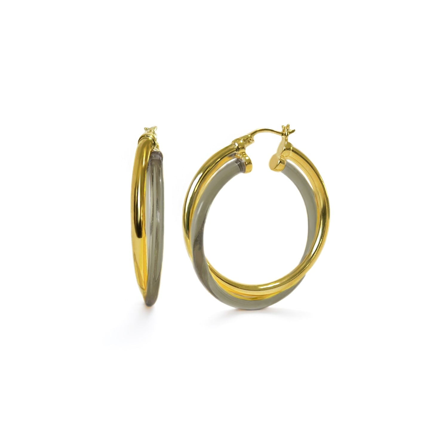 These hoops are crafted from a gold-plated metal and lightweight lucite in a blackberry finish. They feature a unique crossover design for a modern look.
