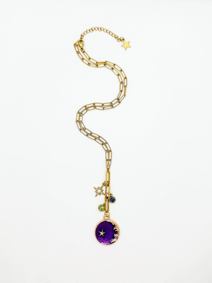 This necklace is made with a gold-filled chain and features a purple medallion with a golden crescent moon and cubic zirconia charms.