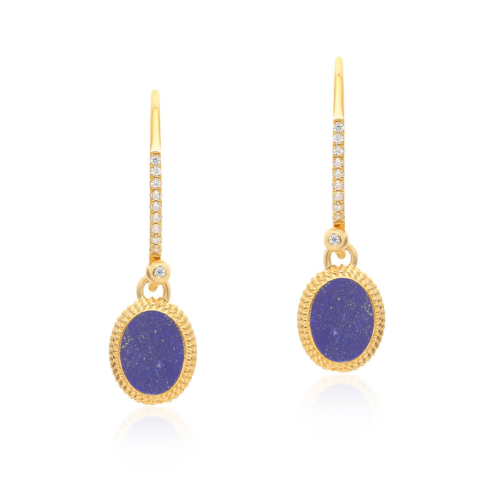 These Ara Woven Lapis Lazuli Drop Earrings by Preeti Sandhu highlight the natural allure of Lapis with its deep blue hue and golden flecks. Handcrafted with sterling silver layered in 14k gold, their oval-cut stones exude richness and protective energy. A timeless design that pairs luxury with natural power.