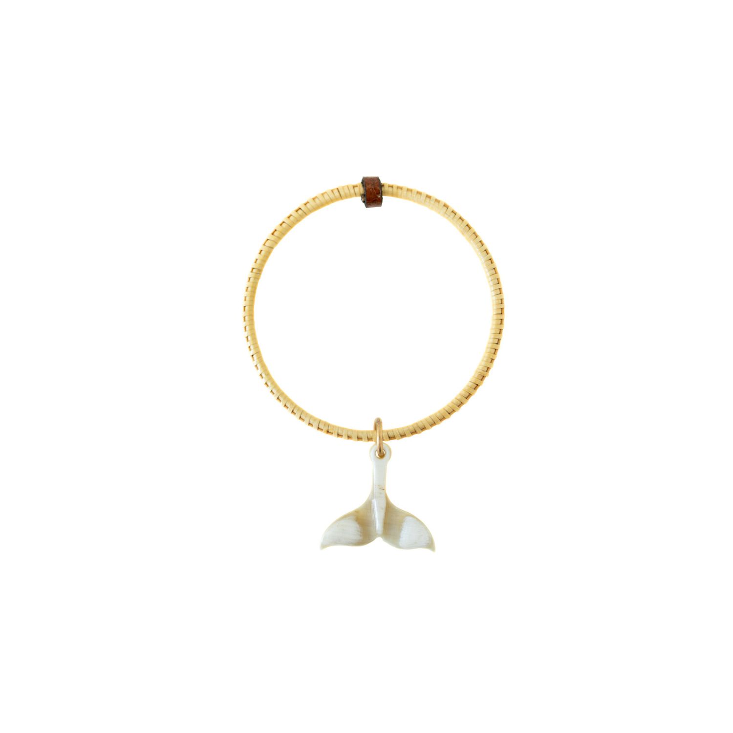 This bangle features a charm hand-carved from buffalo horn in a whale tail design. The product description does not explicitly state the material of the bangle itself.