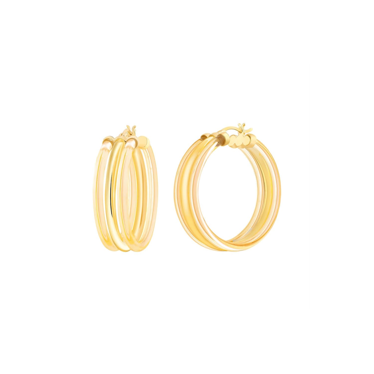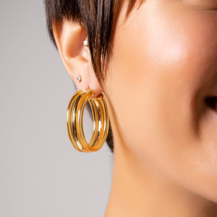 These hoops are crafted from a gold-plated metal and lightweight lucite in a honey finish. They feature a three-hoop design for a unique, dimensional look.