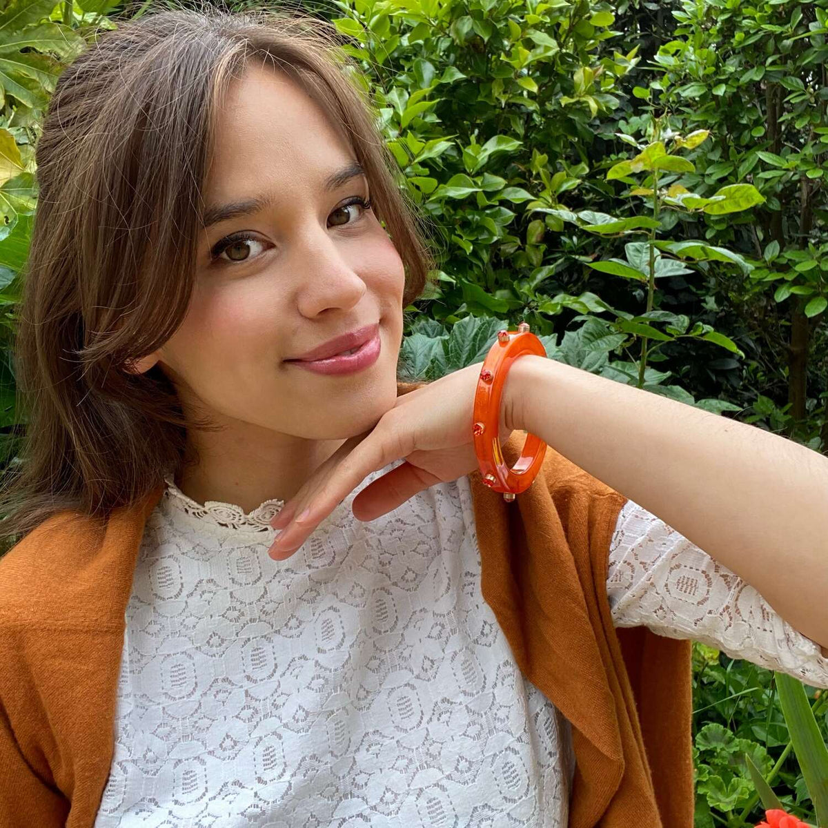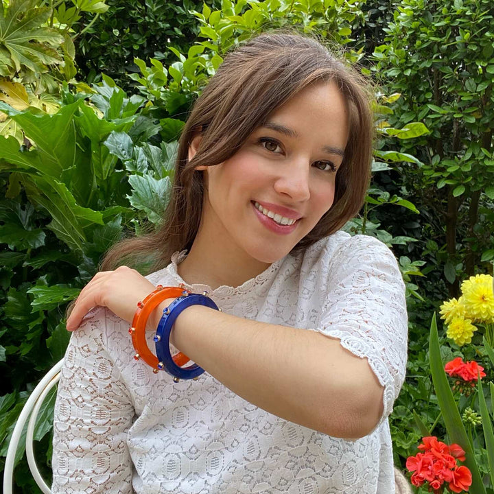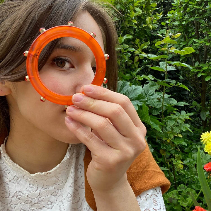This bangle is crafted from translucent orange resin and is adorned with faceted stones set in brass.