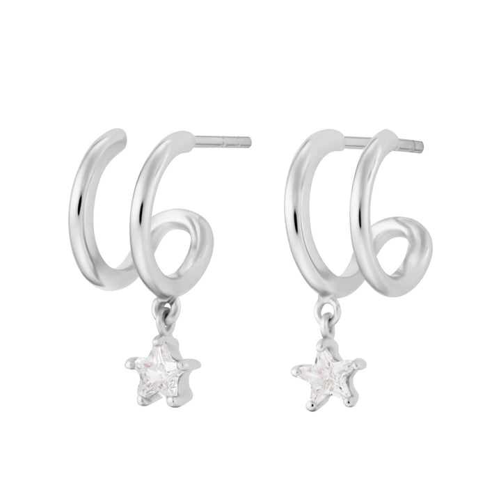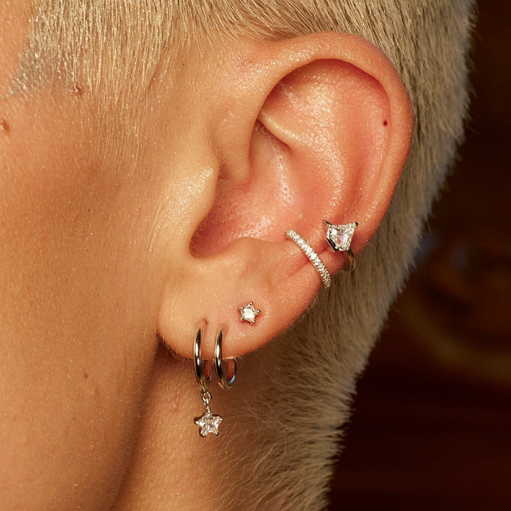 These Silver Illusion Hoop Earrings With Star Drop by Scream Pretty are a clever and stylish accessory that gives the illusion of a double piercing. The delicate star-shaped cubic zirconia stone gracefully hangs from a slim hoop, creating a beautiful sparkle and subtle movement. This design is perfect for those who want to be on-trend without the commitment of a new piercing. They are a versatile and elegant piece for gifting or for adding a touch of magic to your party look.