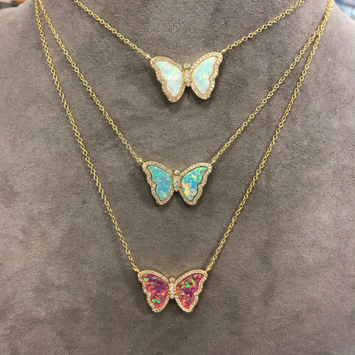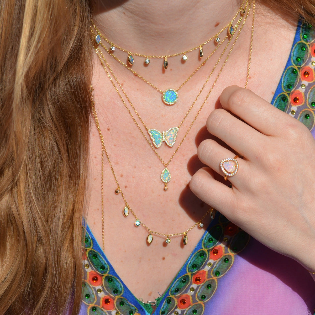 This Opal Butterfly Necklace in Pink by Kamaria symbolizes transformation with ethereal beauty. Crafted with lab-created opal wings surrounded by sparkling pave crystals, it glimmers with light and meaning. Adjustable for any neckline, it layers seamlessly with chokers or chains, embodying both delicacy and strength.