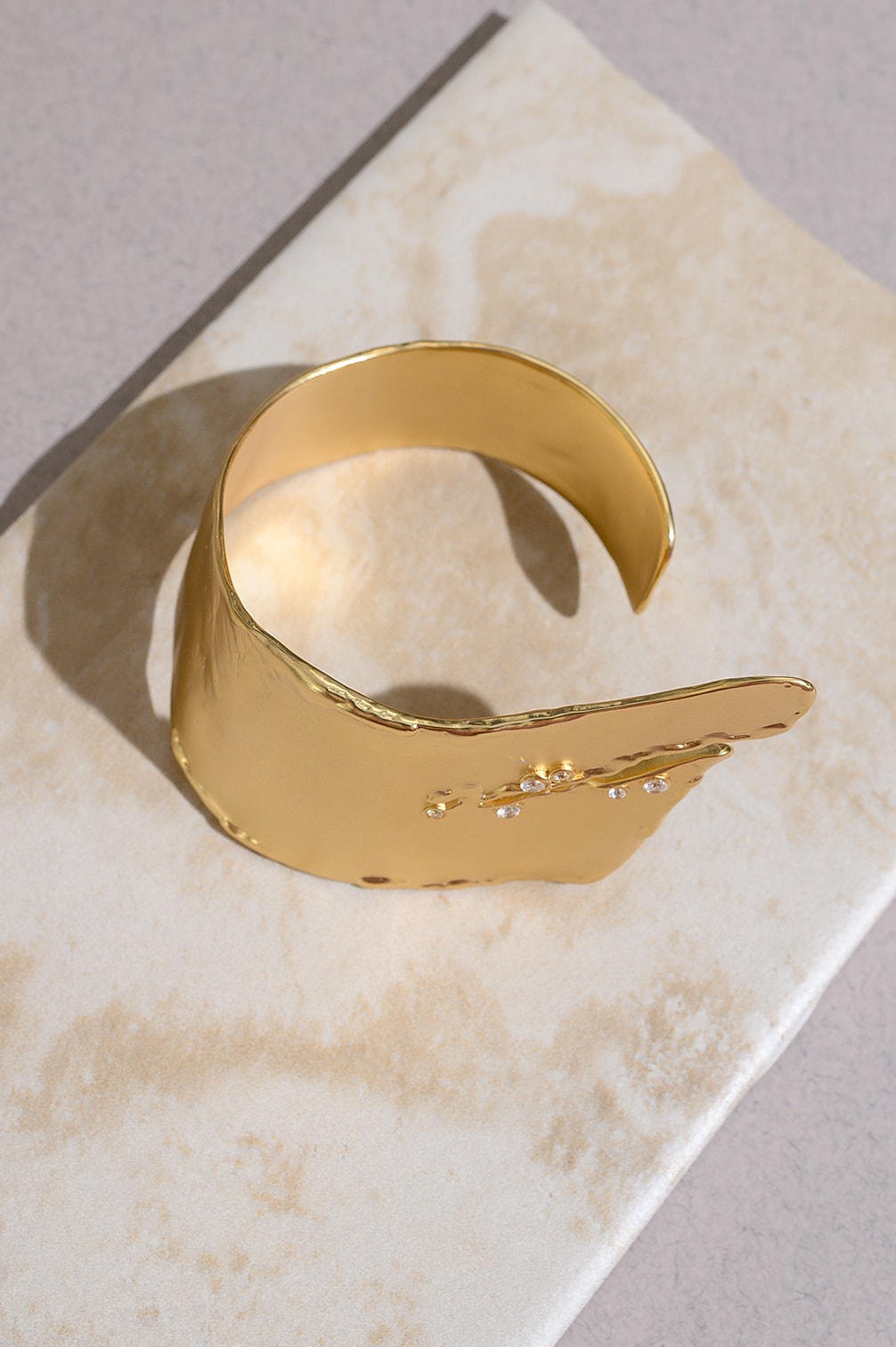 This cuff bracelet is crafted from brass with 14KT real gold plating. It is composed of 85% brass, 10% 14KT gold plating, and 5% gemstones/CZ.