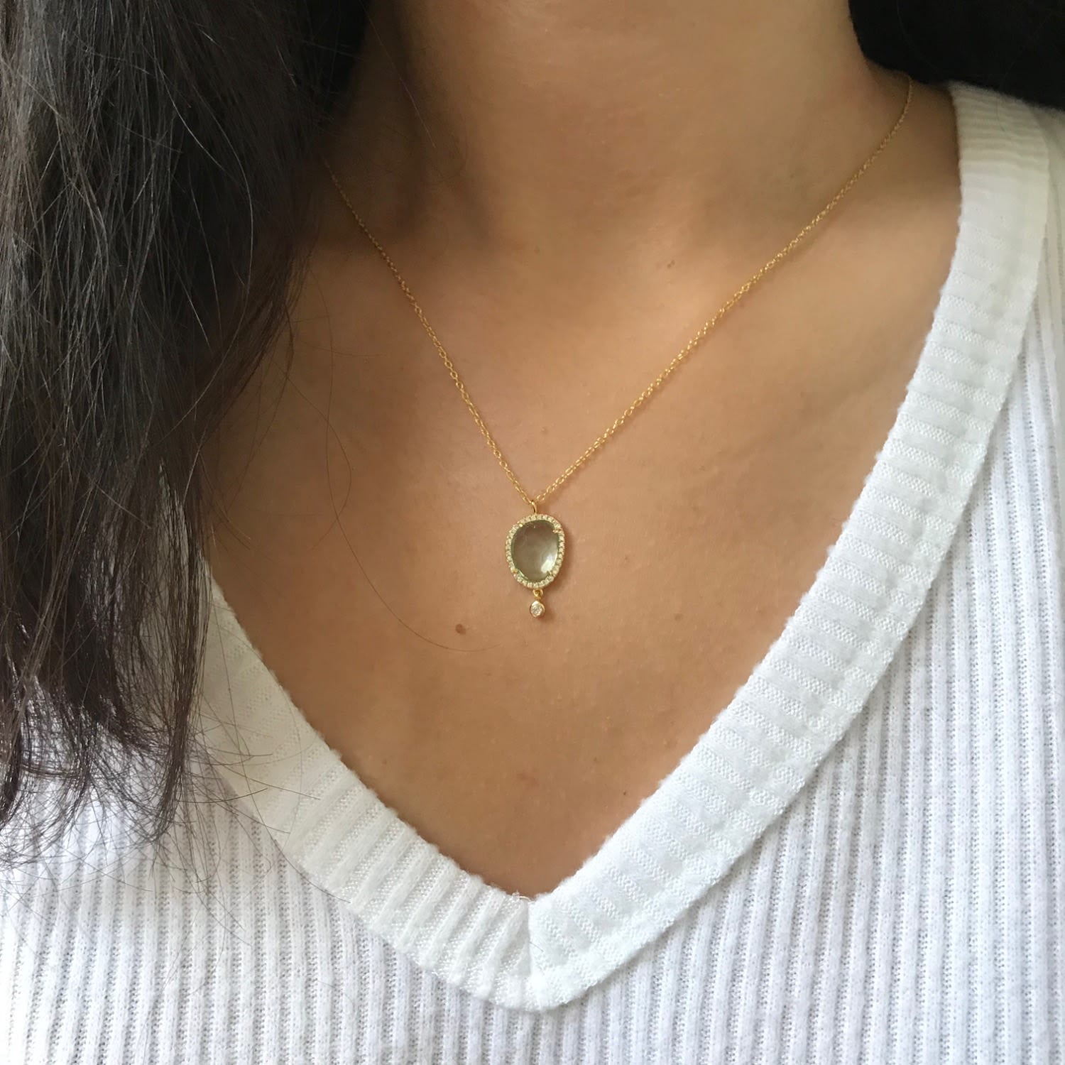This necklace is crafted with a 14k gold-plate over 925 sterling silver and features a lab-created London blue topaz gemstone with pave crystals. It has an adjustable silicon slider clasp and can be worn up to 46cm in length.