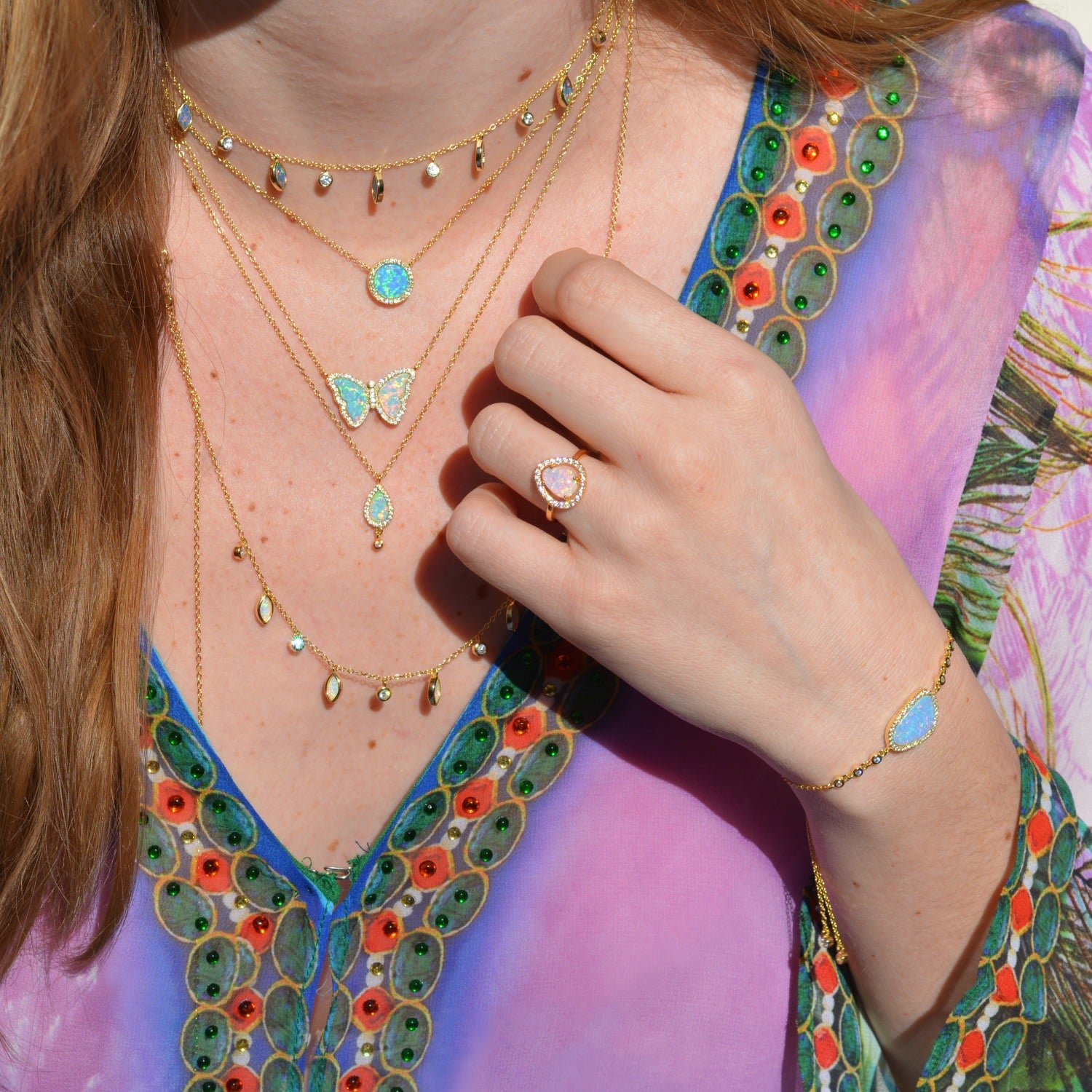 Lab-created opal set in 925 sterling silver with 14K gold plating and pavé crystal accents. Adjustable silicon slider clasp; length up to 46 cm.