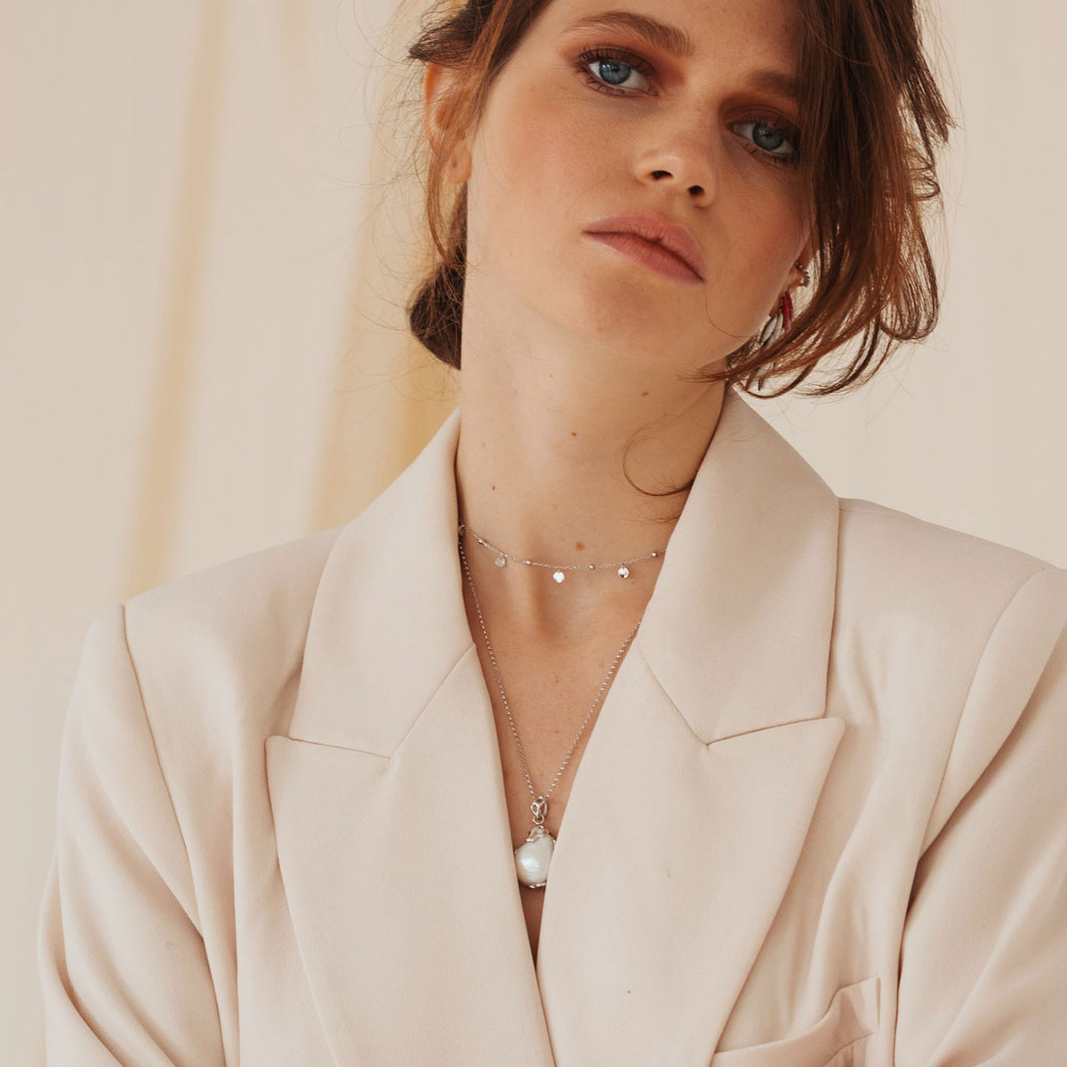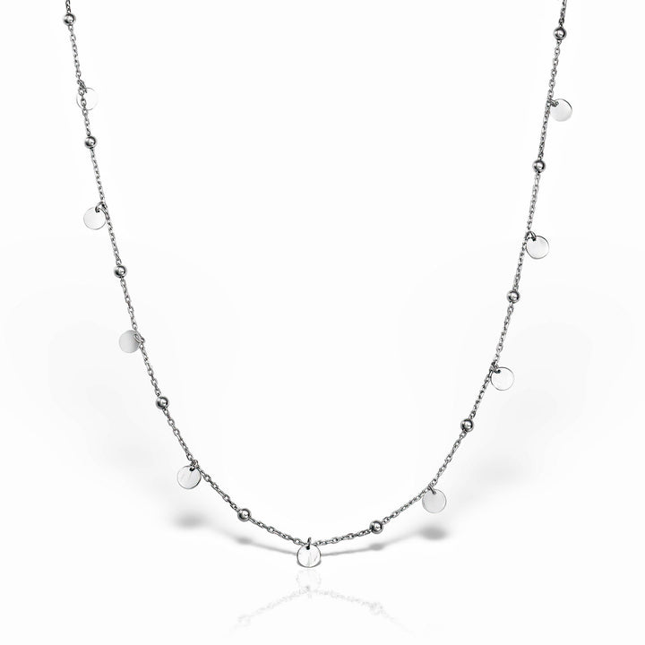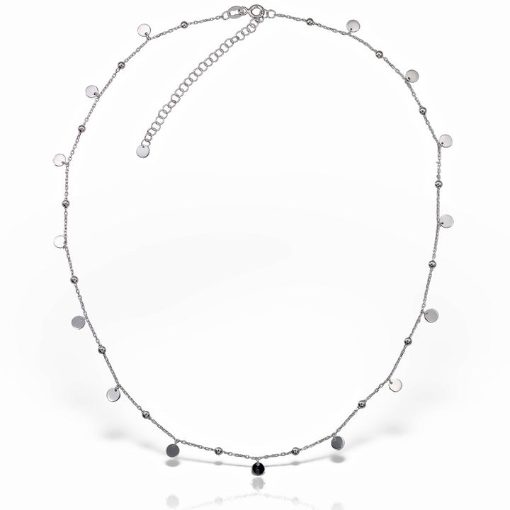 This choker is made from 925 Sterling Silver with Rhodium Plating. It is adorned with small round disc charms and measures 35 cm with a 5 cm extension.