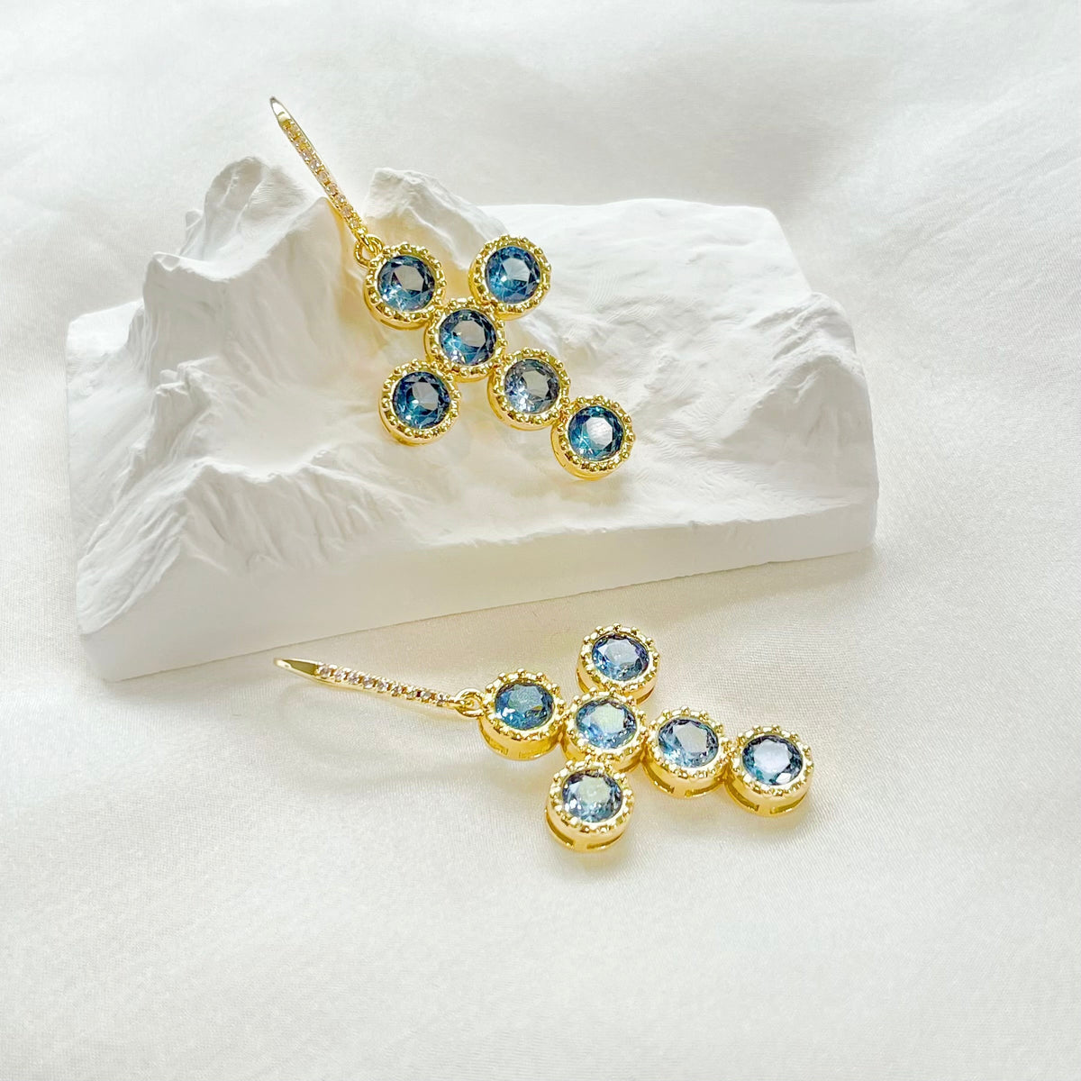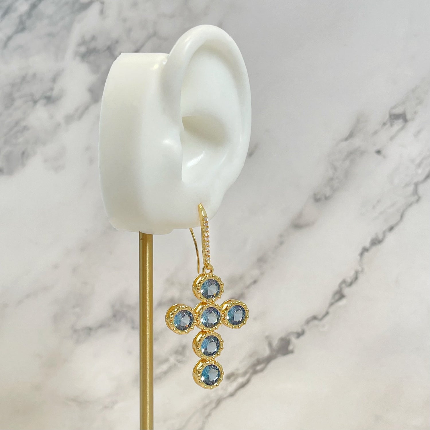 These earrings are made from gold-plated brass with zirconia and feature 925 silver posts. They have a large zircon set in an intricately designed cross.