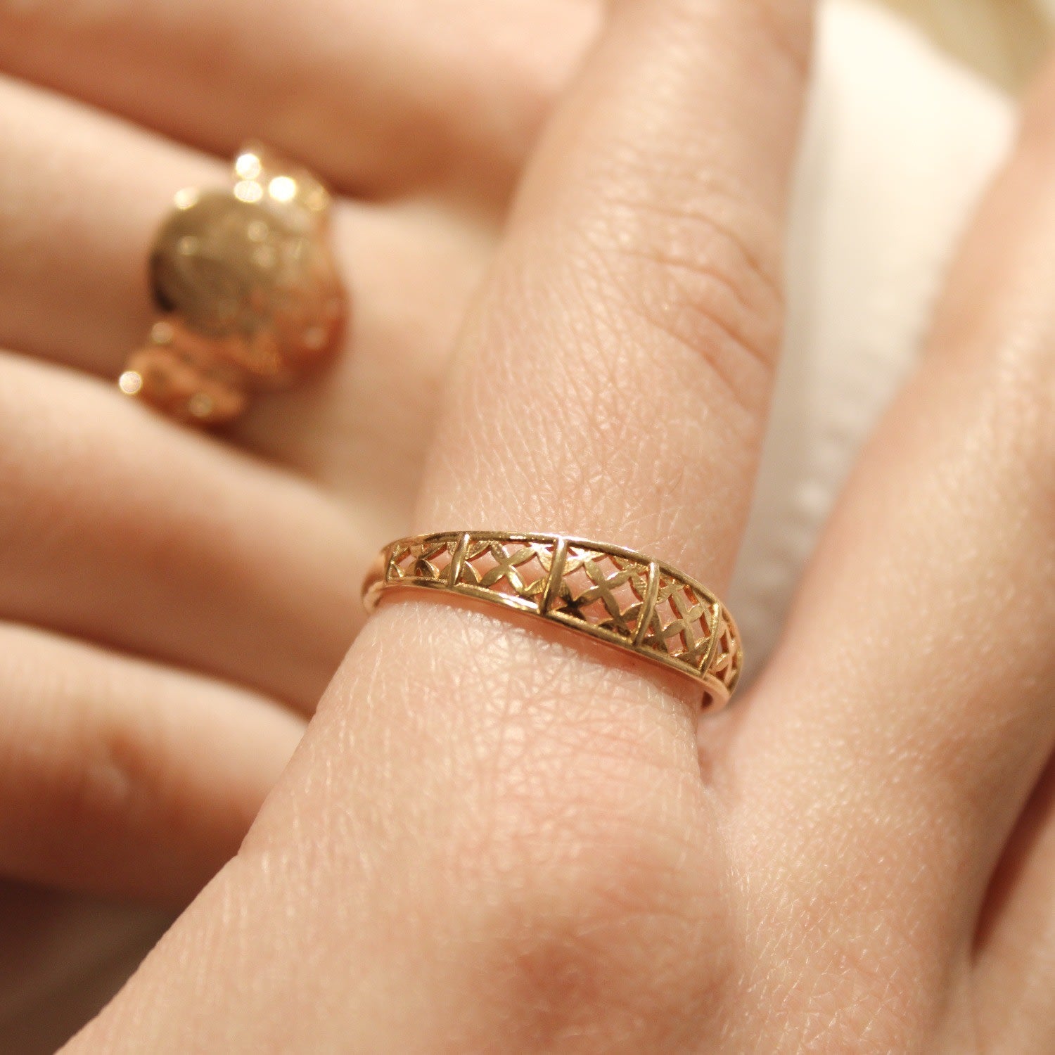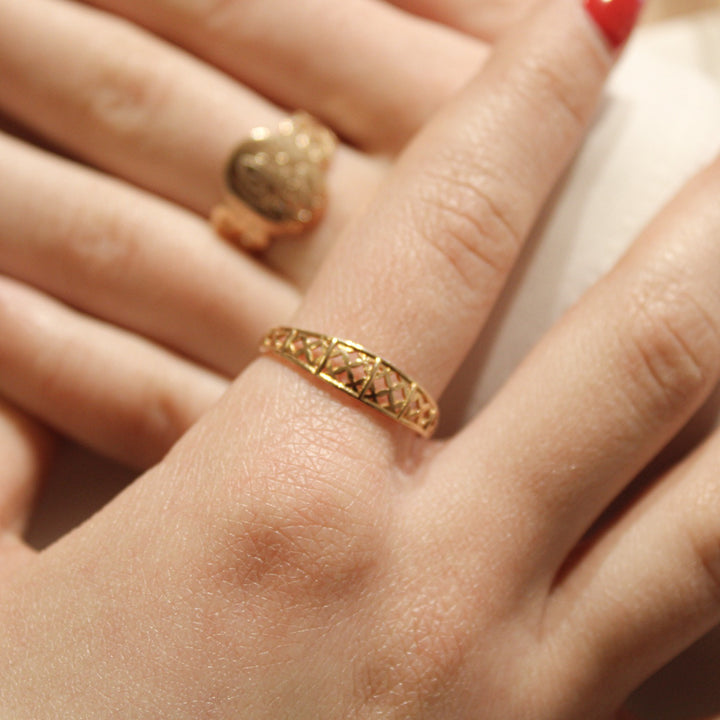 This ring is crafted from sterling silver and has a gold-plated finish. It is inspired by the Art Nouveau style.