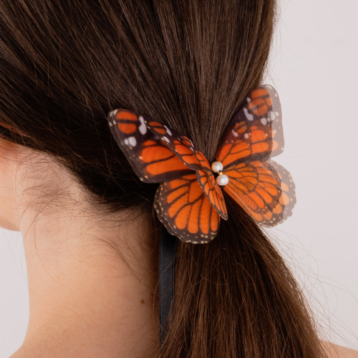 This Monarch Butterfly Ribbon Tie Choker Necklace by Oanasavu.creations is a unique and artistic accessory. The piece features a meticulously handcrafted monarch butterfly made of 100% silk, giving it translucent and lightweight wings that move with the wearer. The butterfly is sewn to a high-quality silk satin ribbon tie, allowing it to be worn as a choker, in the hair, on the wrist, or even as a belt. The necklace also features freshwater pearls.