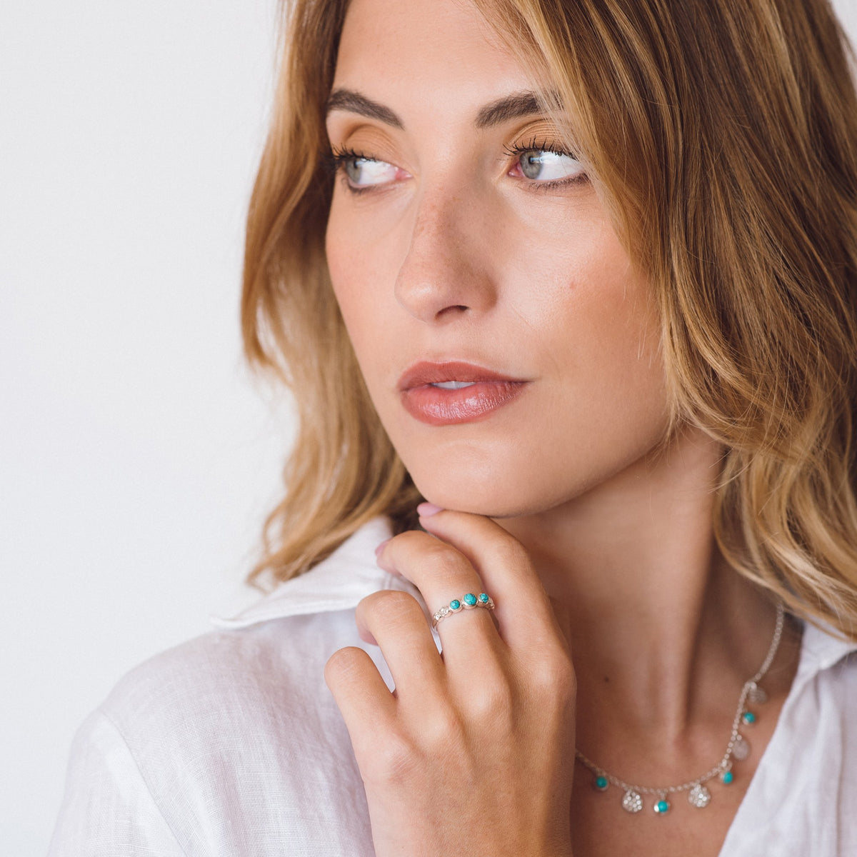 Sterling silver band set with turquoise gemstones (0.4cm and 0.3cm). Handmade. Also available in gold vermeil.