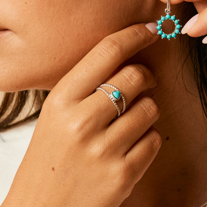 This Trillion Rawa Silver Stacking Ring - Turquoise by Charlotte's Web Jewellery is a beautiful and ethical accessory that helps you find balance. It features a genuine turquoise gemstone, the December birthstone, which is believed to align the Chakras and instill inner calm. The double-band ring is handcrafted in sterling silver with tiny Rawa balls, making it an elegant and fairtrade piece that is perfect for stacking.