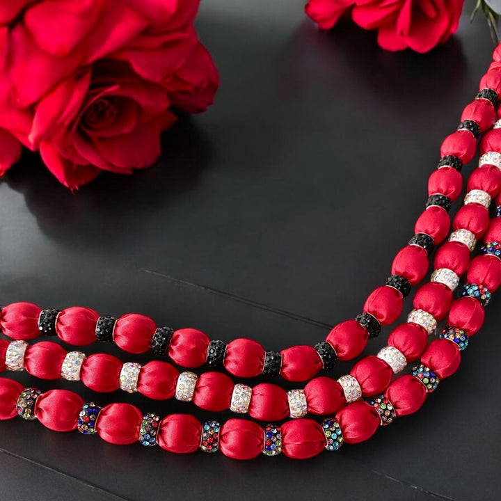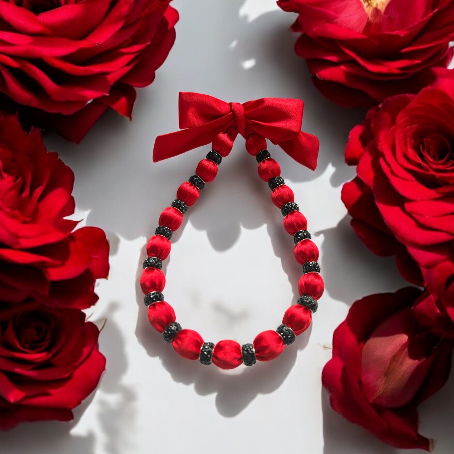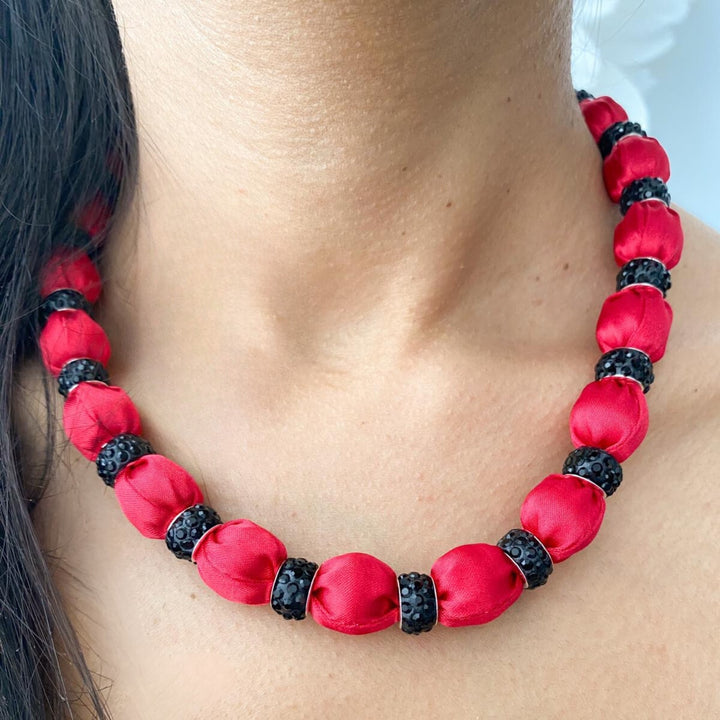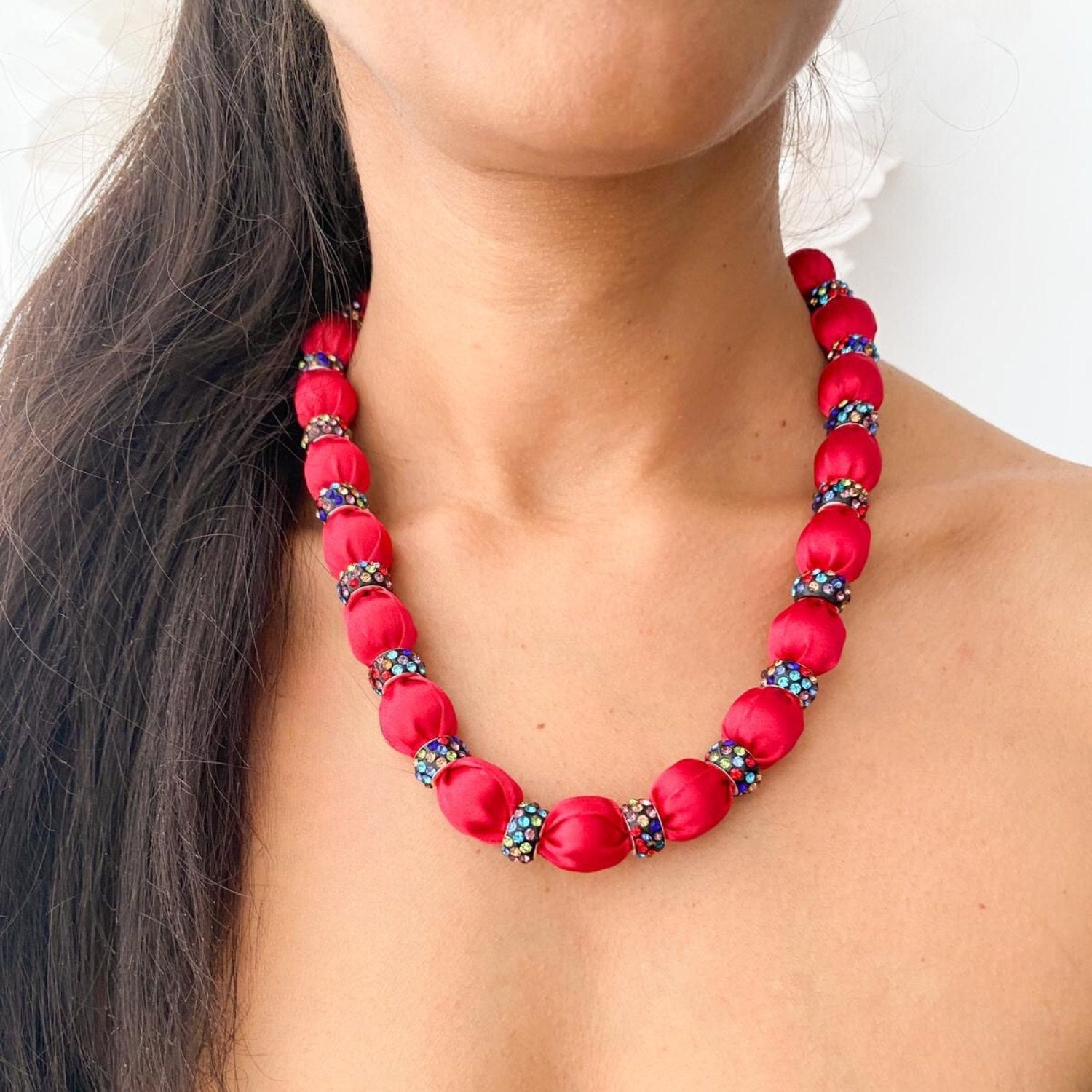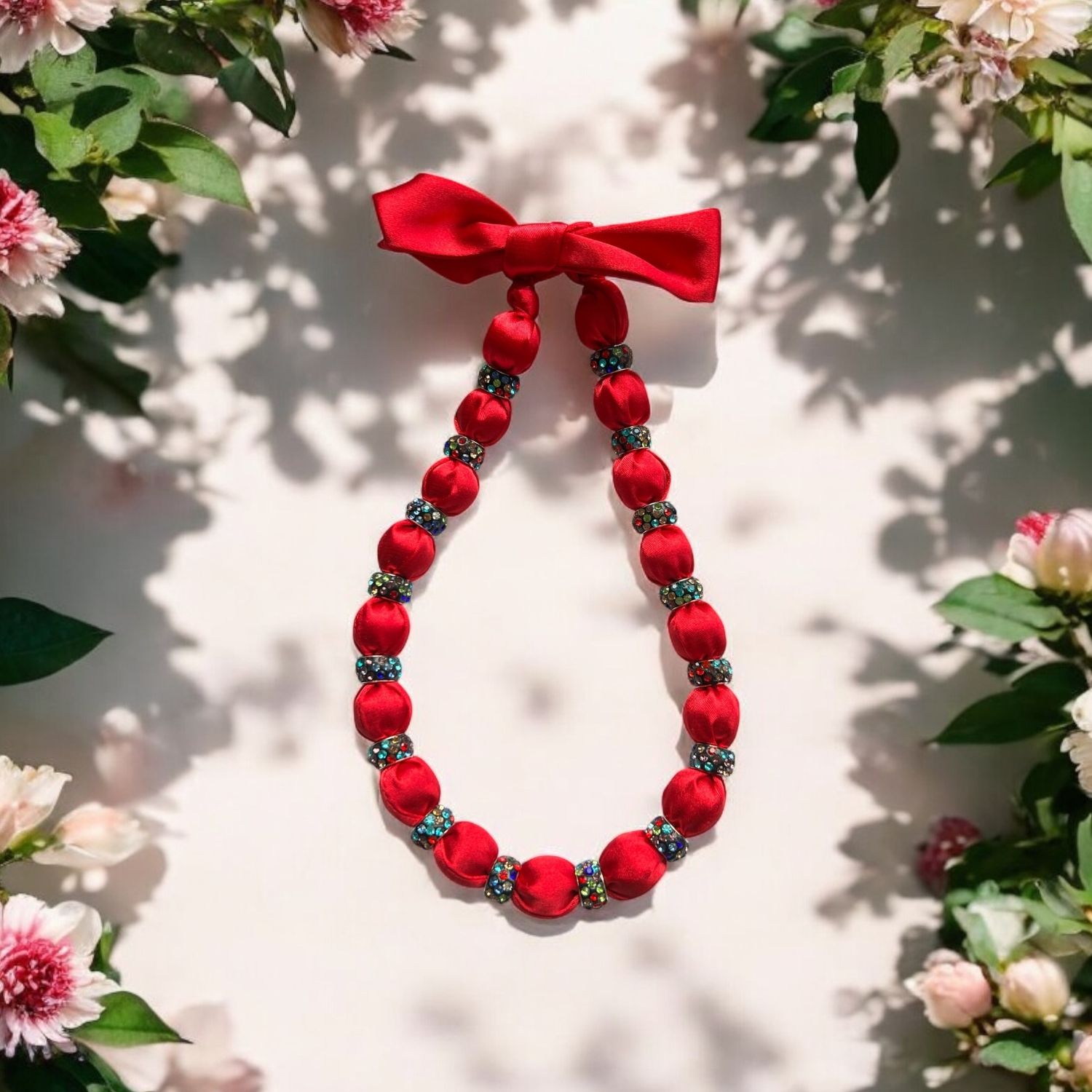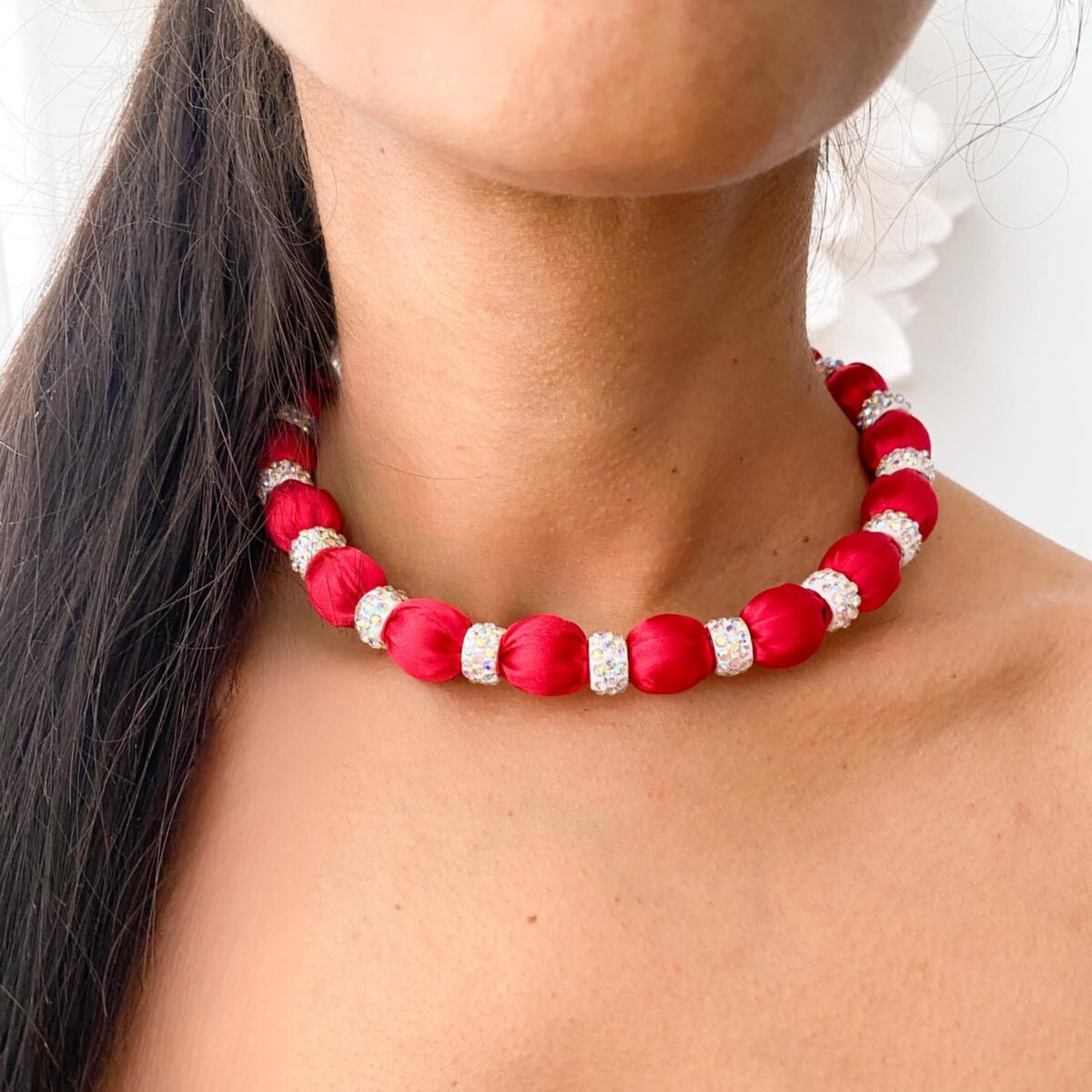 Embellished Necklace On Luxe Red Satin With Beaded Crystals