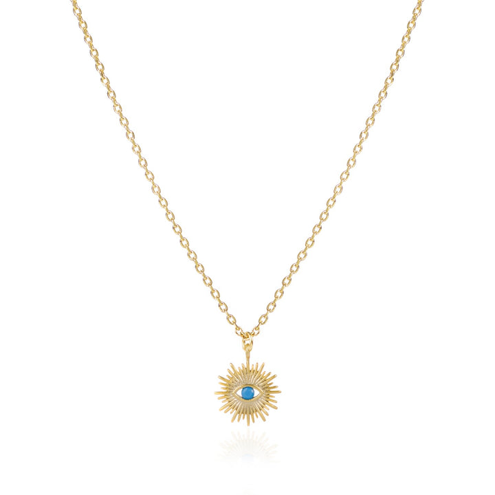 This necklace is crafted from 16k gold-plated metal and features a turquoise eye charm.
