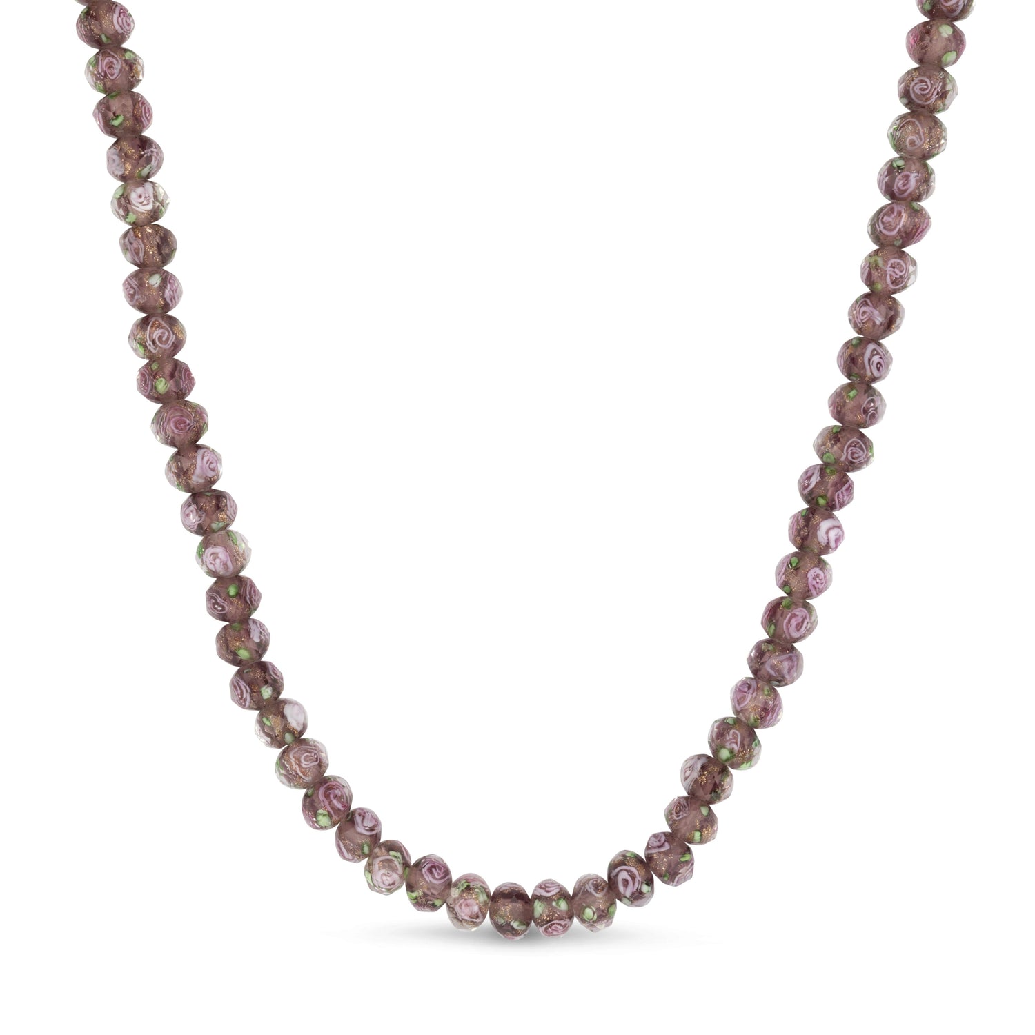 This necklace features faceted glass beads with an internal rose pattern. The hardware is made from hypoallergenic 925 sterling silver which is plated in either rhodium or 18k gold.