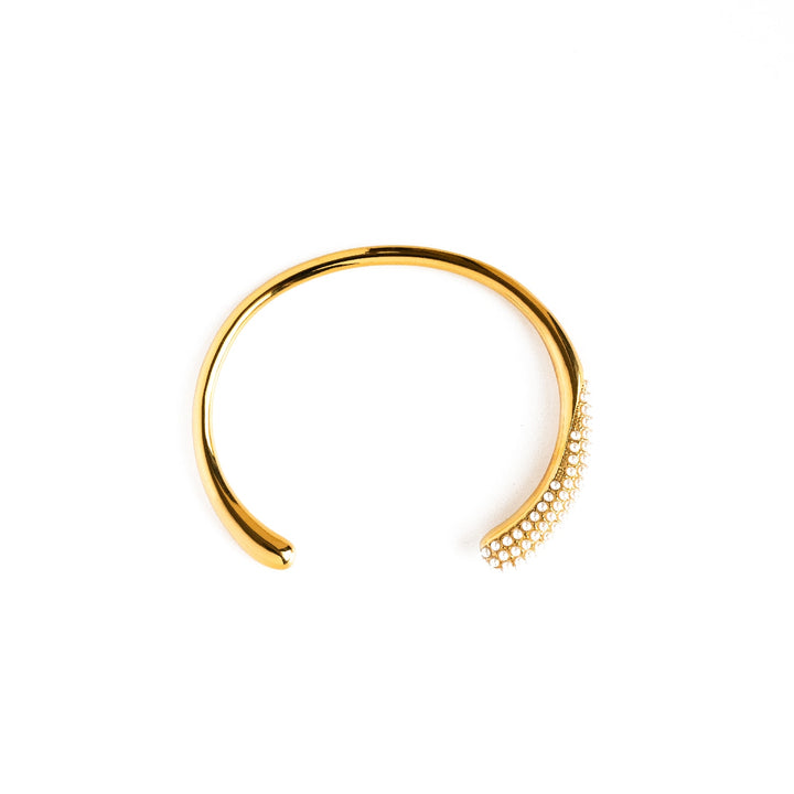 This adjustable bangle is crafted from 18k gold stainless steel. It features multicolored cubic zirconia gemstones.