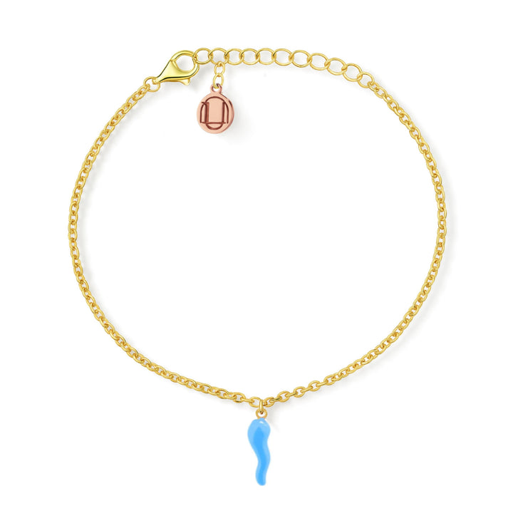 Handcrafted in Italy in 925 sterling silver, also available in 18k yellow gold vermeil. Sky blue enamel cornicello pendant. Refined link chain bracelet with secure closure.